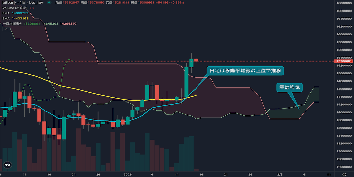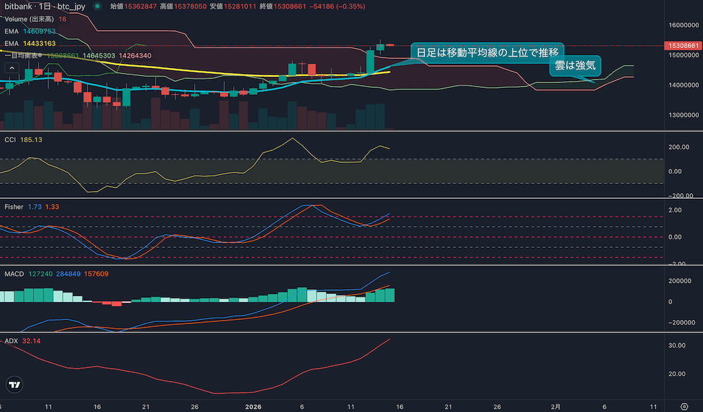 - 価格は14EMA(1450万円)を上回り強気示唆です。53EMA(1439万円)は上昇しており、長期トレンドも強気です。一目均衡表の雲は先行スパン1(1464万円)が先行スパン2(1426万円)を上回り強気示唆です。