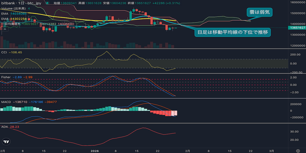 - 昨日のビットコインは0.2%下落し、終値は1360万円でした。日足は移動平均線の下位で取引され、弱い値動きが見られます。