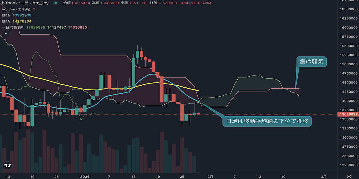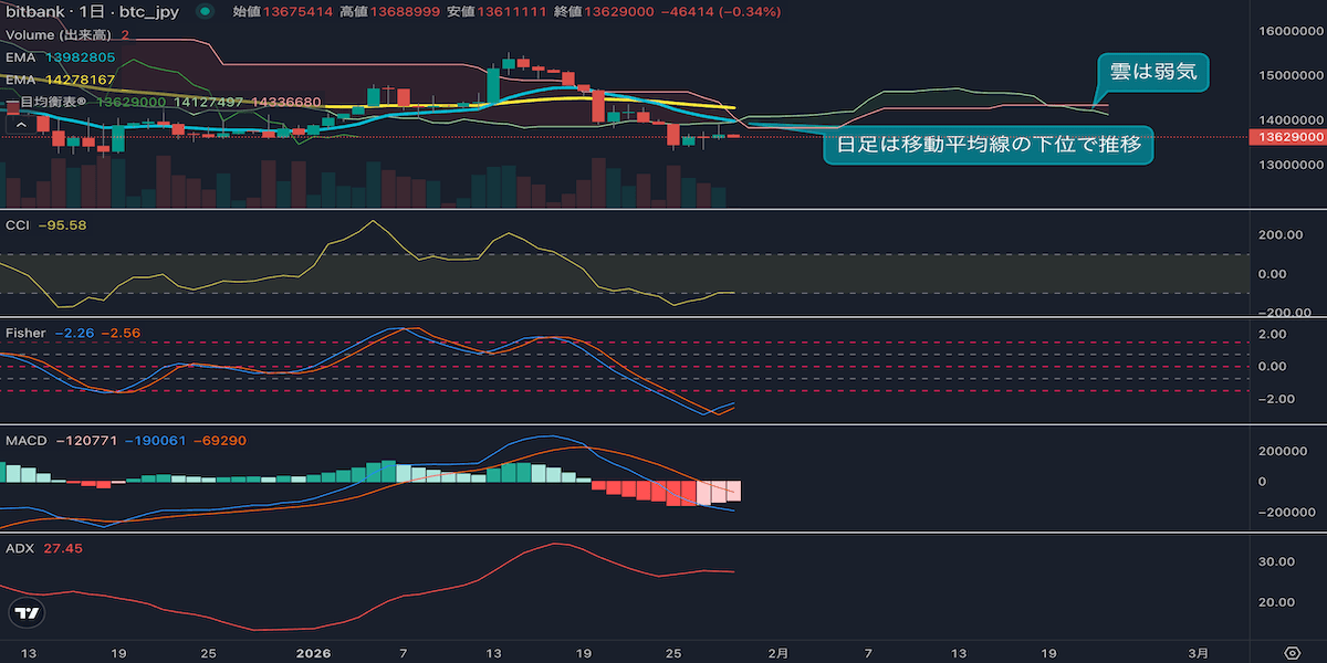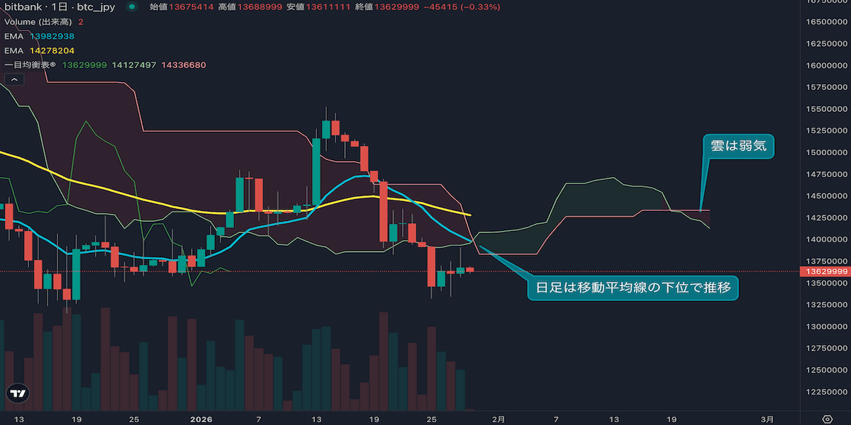 - 価格は14EMA(1403万円)を下回り弱気示唆です。53EMA(1430万円)は下落しており、長期トレンドも弱気示唆です。一目均衡表の雲は先行スパン1(1421万円)が先行スパン2(1433万円)を下回り弱気示唆です。