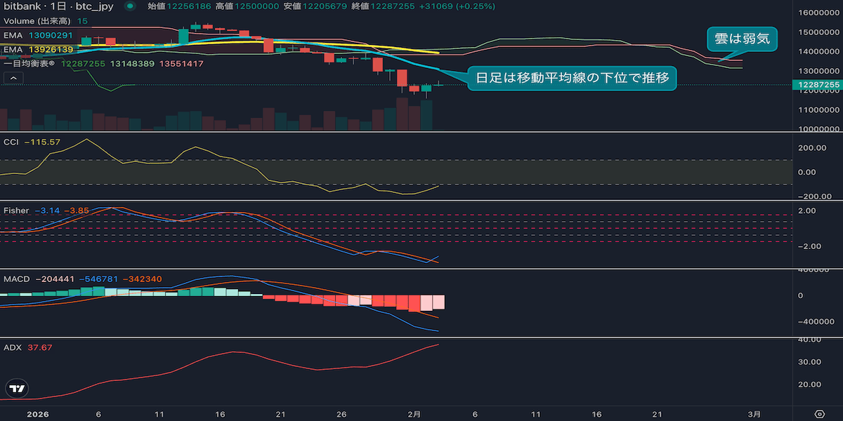 ビットコイン日足分析(2月2日)|反発も弱く、下落トレンド継続に警戒