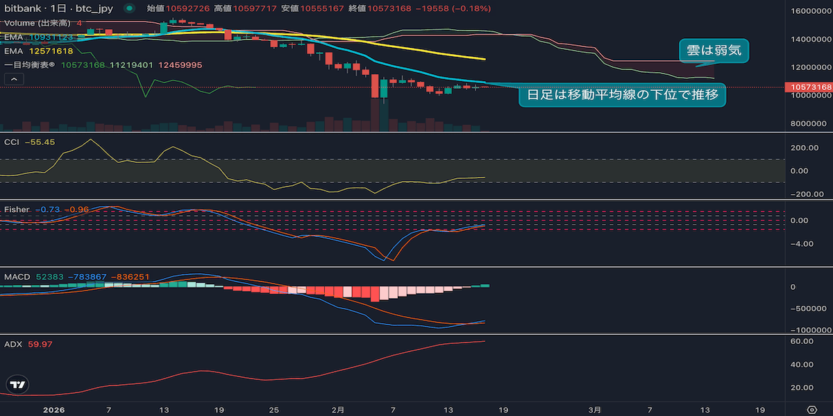ビットコイン弱気継続か?1000万円割れ目前、MACDはゴールデンクロス発生【2月15日分析】