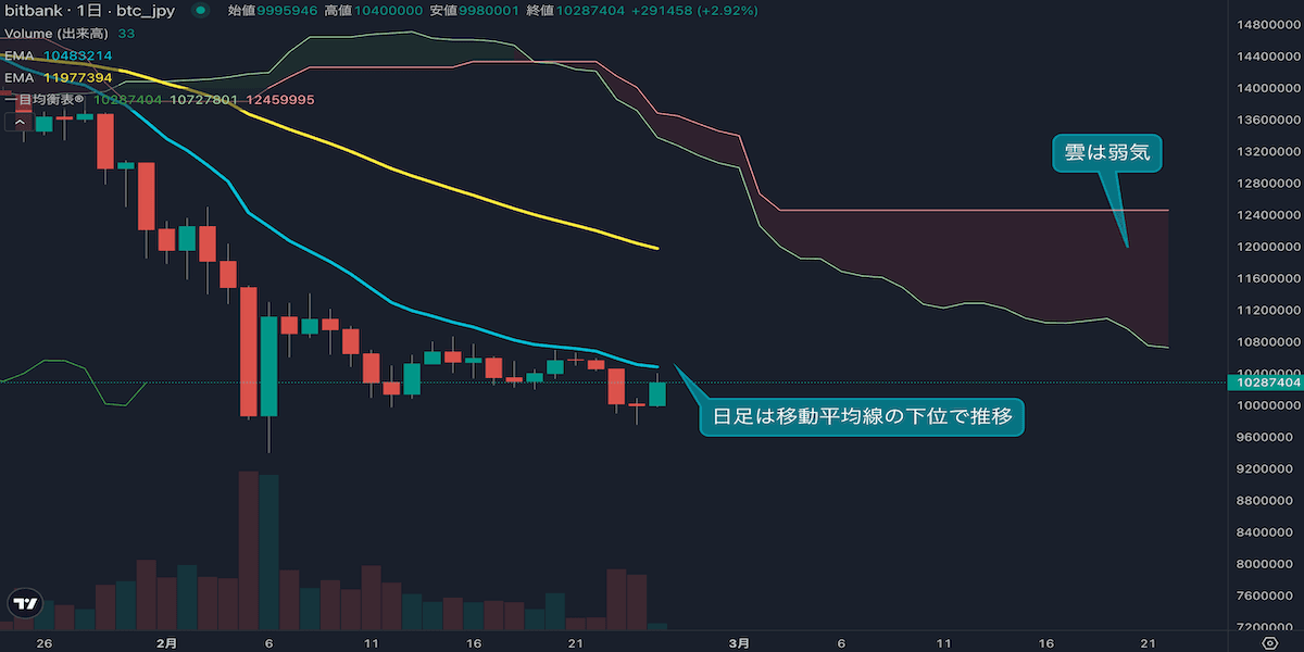 - 価格は14EMA(1051万円)を下回り、弱気を示唆しています。53EMA(1204万円)も下落しており、長期トレンドは弱気を示唆しています。一目均衡表の雲は先行スパン1(1075万円)が先行スパン2(1345万円)を下回り、弱気を示唆しています。