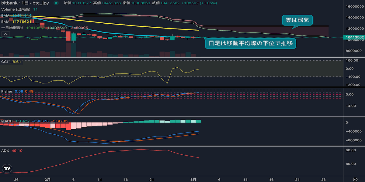 - 昨日のビットコインは1.6%上昇し、終値は1030万円でした。週末はほぼ横ばいの推移となりましたが、一時1000万円を割り込む動きが見られます。日足は再び移動平均線を下回り、弱気の値動きとなっています。