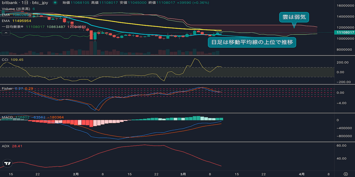 - 今週のビットコインは買いが優勢となっており、3月に入り底堅さが戻ってきています。テクニカル的には価格の上位に長期移動平均線や一目均衡表の雲が位置しており、上値が重くなりやすいゾーンとなっています。