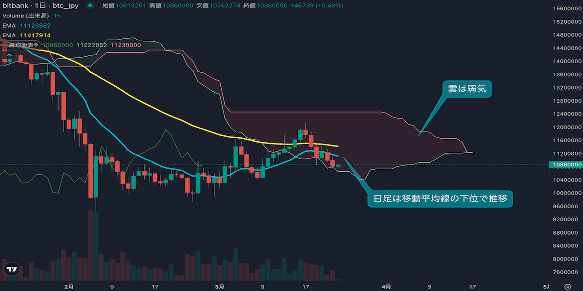 - 価格は14EMA(1116万円)を下回り弱気を示唆しています。53EMA(1143万円)は下落し、長期トレンドも弱気を示唆しています。一目均衡表の雲は先行スパン1(1122万円)が先行スパン2(1124万円)を下回り、弱気を示唆しています。