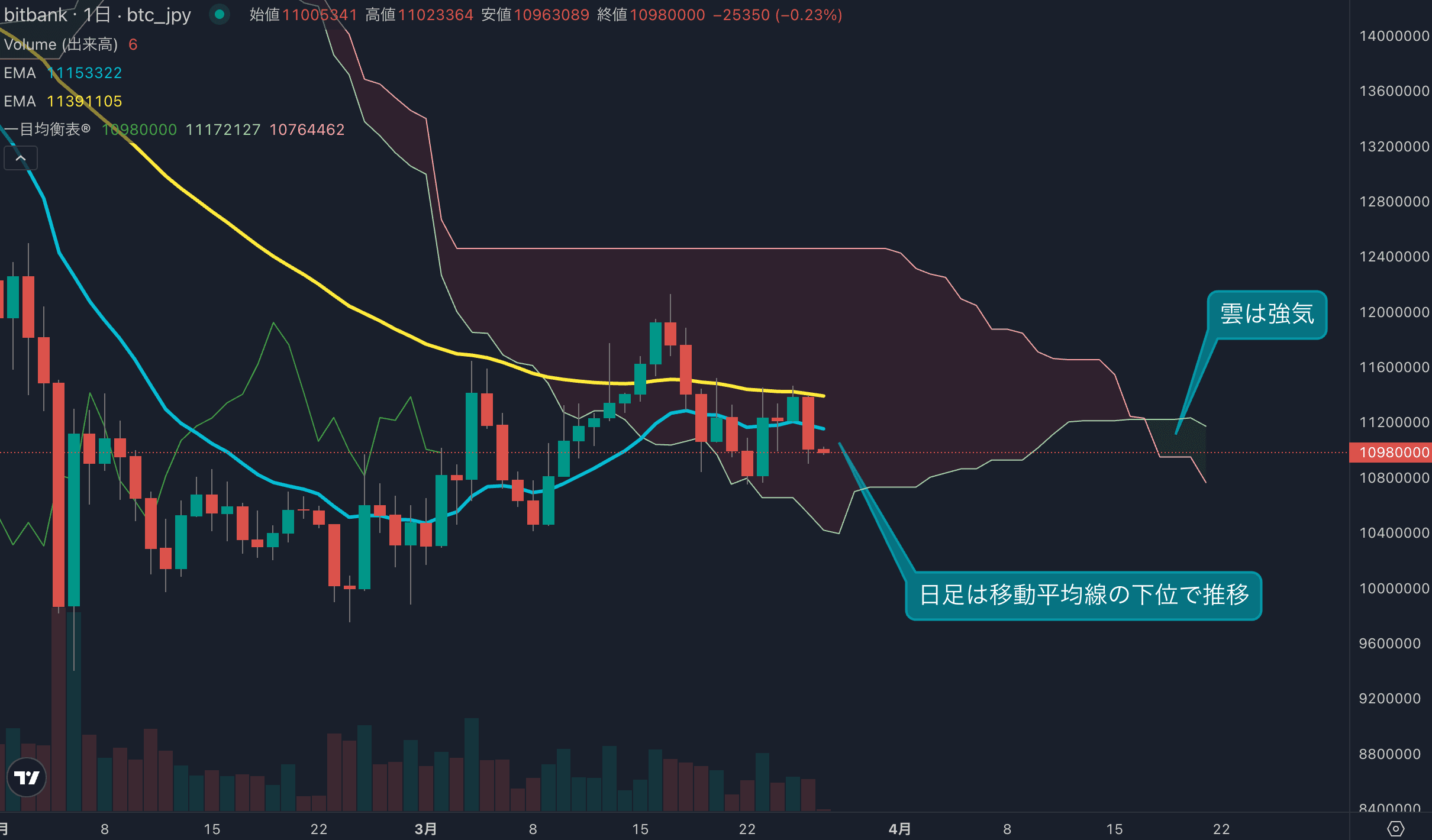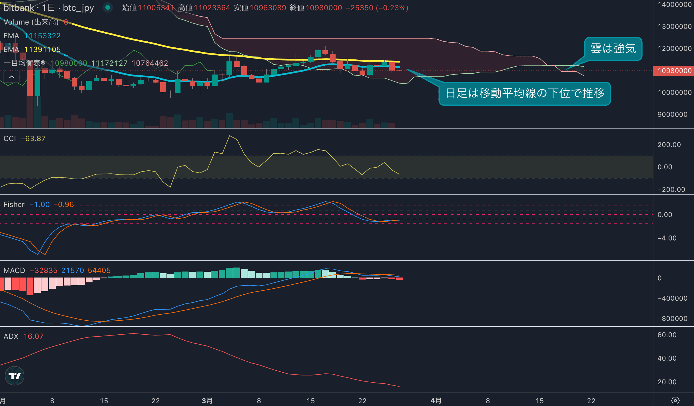 - 価格は14EMA(1117万円)を下回り弱気を示唆しています。53EMA(1140万円)は下落し、長期トレンドは弱気を示唆しています。一目均衡表の雲は先行スパン1(1123万円)が先行スパン2(1095万円)を上回り、強気を示唆しています。