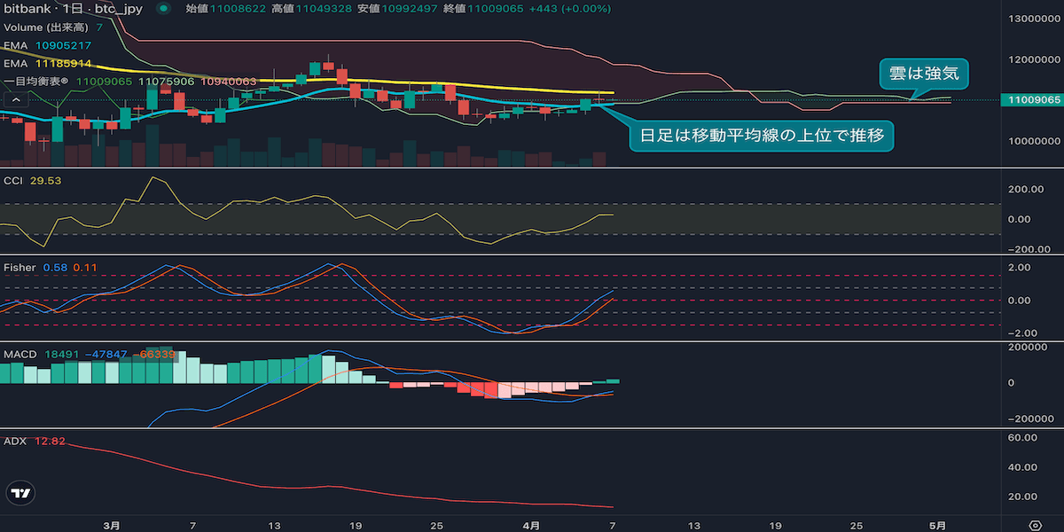 - 昨日のビットコインは0.1%下落し、終値は1100万円でした。一時は長期移動平均線(1119万円)近辺まで上昇しましたが、高値を維持することはできませんでした。日足は短期の上昇が一服したことを示すドージ足を記録しました。