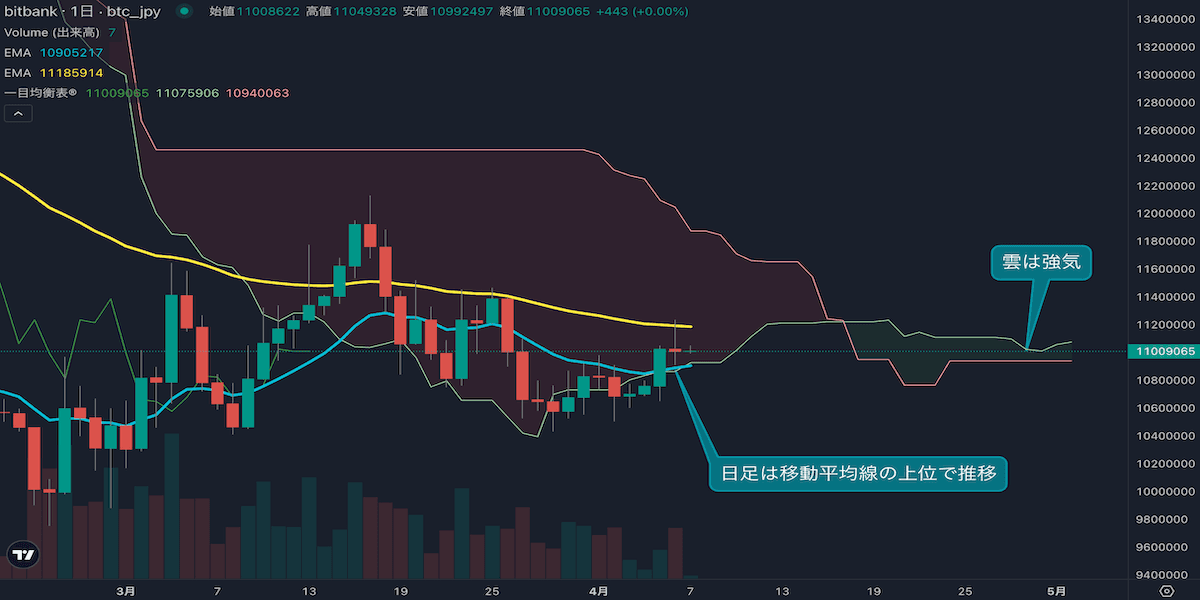 - 価格は14EMA(1088万円)を上回っており、強気を示唆しています。53EMA(1119万円)は下落しており、長期トレンドは弱気を示唆しています。一目均衡表の雲は、先行スパン1(1105万円)が先行スパン2(1094万円)を上回っており、強気を示唆しています。