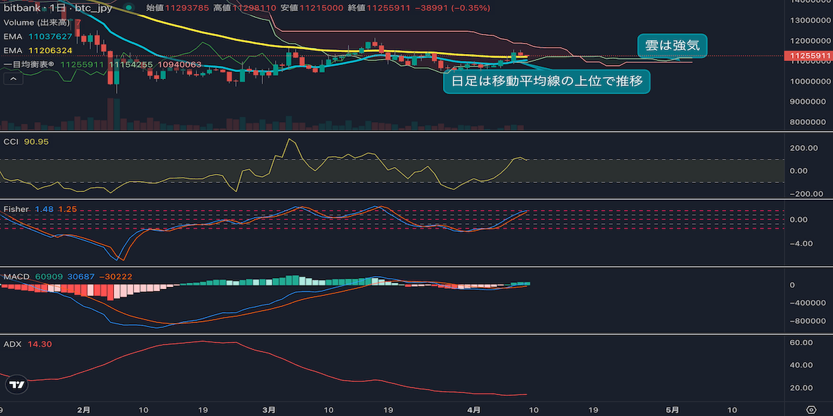 - 昨日のビットコインは1.0%下落し、終値は1129万円でした。一昨日の強い上昇の反動から小幅に売られました。日足は長期移動平均線(53EMA)を上回り、値動きは強気の形を維持しています。