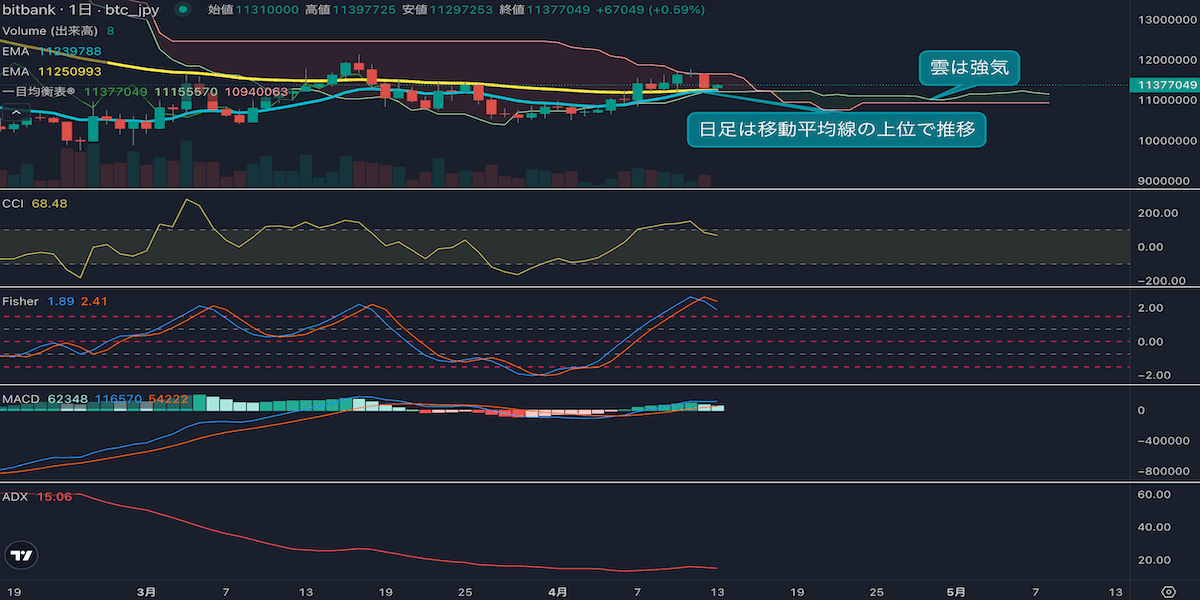 - ビットコインは2月に1000万円近辺まで下落した後はレンジ推移となり、方向感に乏しい相場となっていました。ADXはかなり低下し、長期・短期移動平均線が共に横ばい推移し始め、相場は次のトレンド発生が近いことを示唆しています。トレンドの発生が近いことから、日足と移動平均線の位置関係は重要なテクニカル指標となるでしょう。今後、上下どちらかに大きく動けば、レンジブレイクの示唆となります。