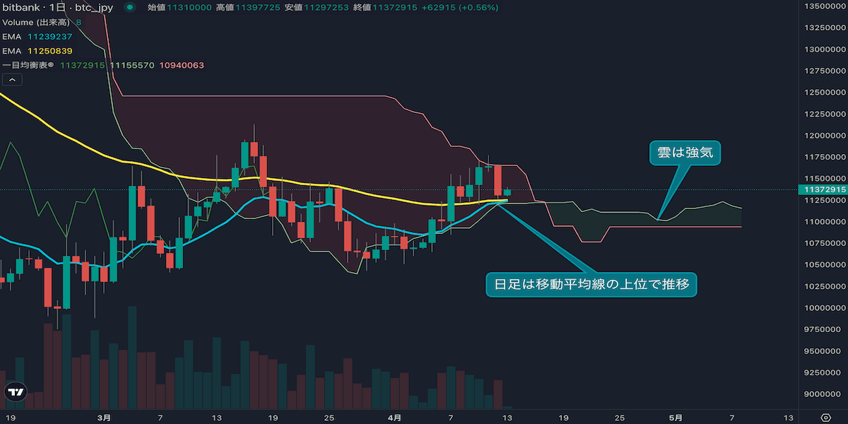 - 価格は14EMA(1121万円)を上回っており、強気を示唆しています。53EMA(1124万円)は横ばいで推移し、長期トレンドは中立を示唆しています。一目均衡表の雲は、先行スパン1(1118万円)が先行スパン2(1094万円)を上回っており、強気を示唆しています。
