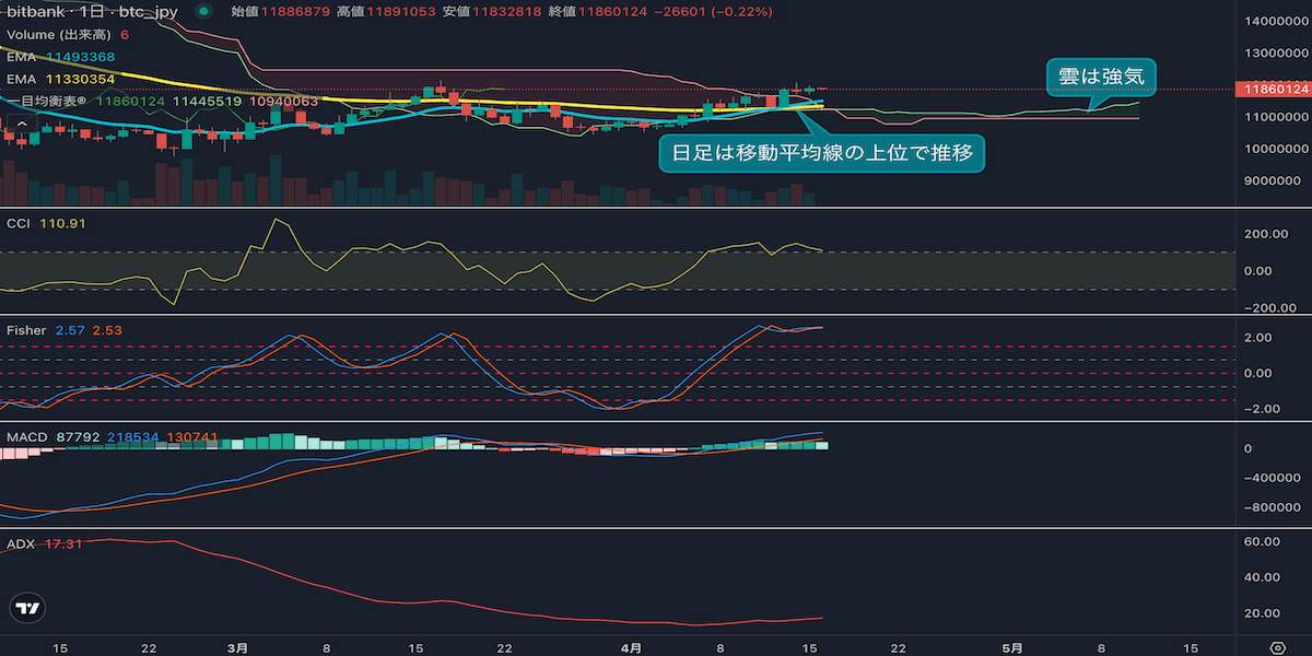 - 価格は14EMA(1143万円)を上回っており、強気を示唆しています。53EMA(1130万円)は上昇し、長期トレンドも強気を示唆しています。一目均衡表の雲は、先行スパン1(1135万円)が先行スパン2(1094万円)を上回っており、強気を示唆しています。