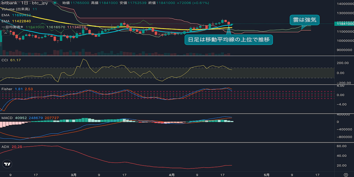 - 昨日のビットコインは2.2%下落し、終値は1176万円でした。週末は下落し、2日連続で陰線を記録しました。足元の値動きは強気の形が維持され、長期移動平均線も上向きに推移し始めています。