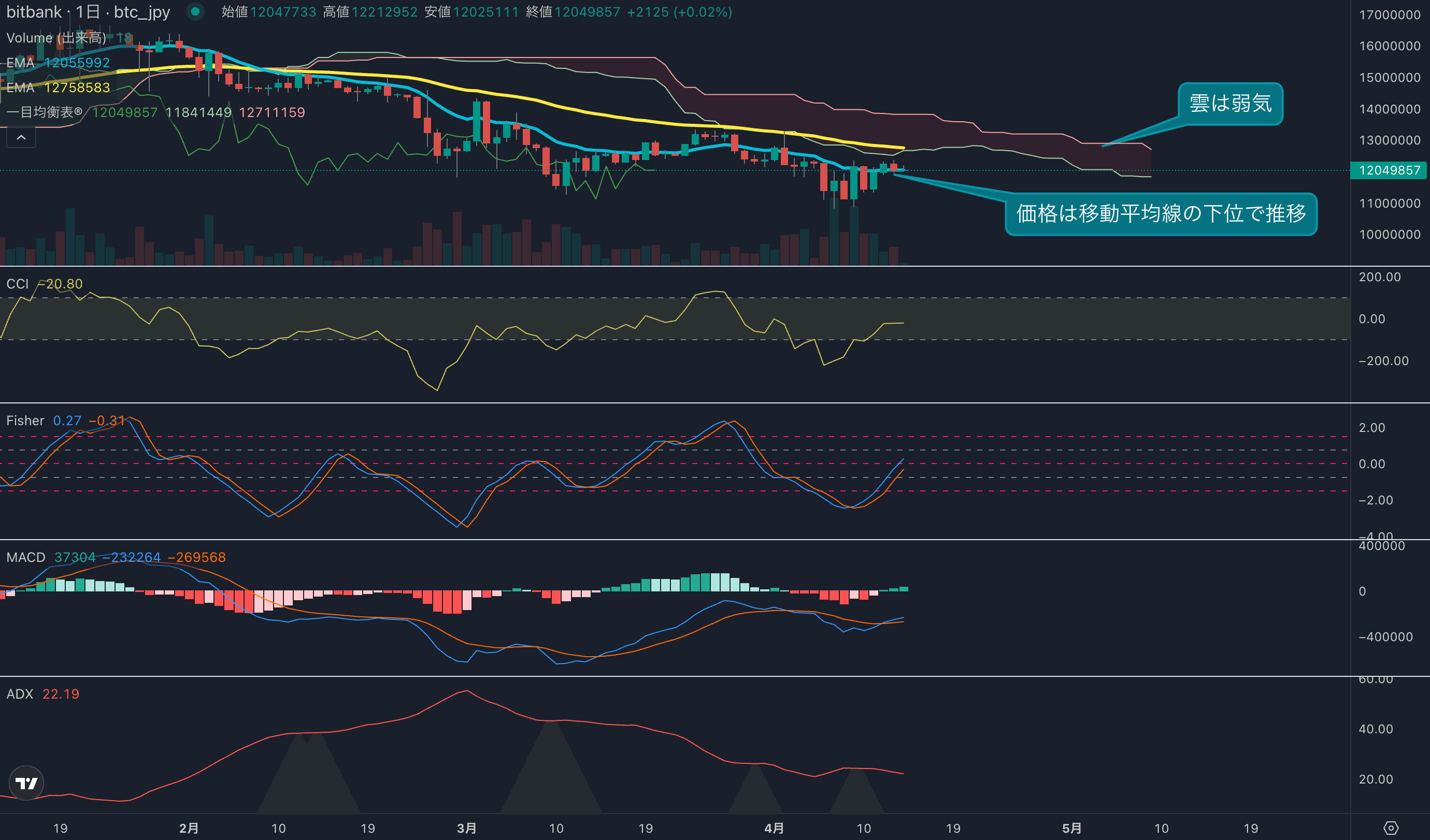 - 昨日のビットコインは1.6%下落し、終値は1204万円でした。週末は底堅い動きがみられましたが、日曜日は小幅に下落しました。日足は移動平均線とほぼ同値で推移しており、強い方向感がない状態です。本日はプラスで取引されており、移動平均線の上位で推移しています。