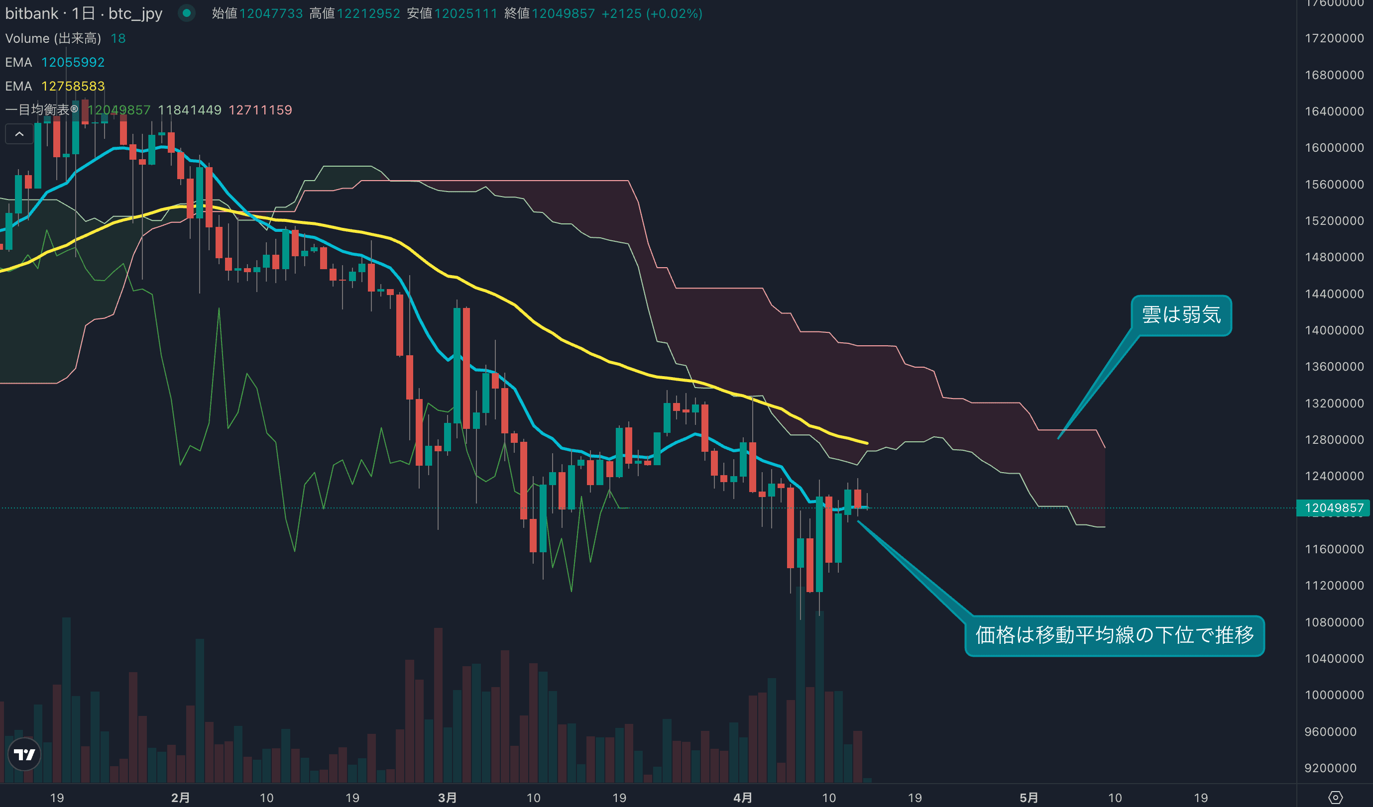 - 価格は14EMA(1205万円)を下回り弱気示唆です。53EMA(1278万円)は下落しており、長期トレンドも弱気です。一目均衡表の雲は先行スパン1(1184万円)が先行スパン2(1290万円)を下回り弱気示唆です。