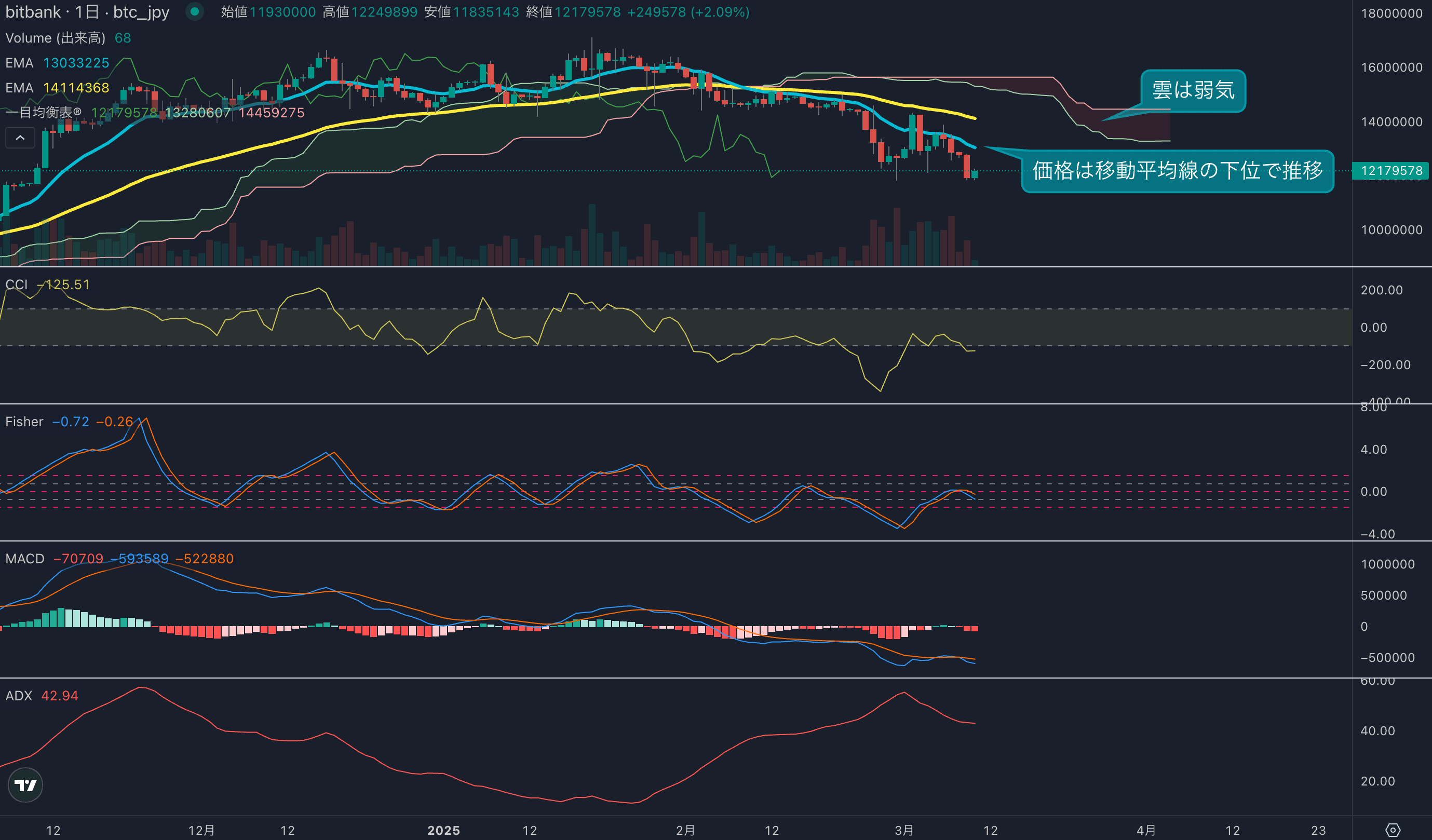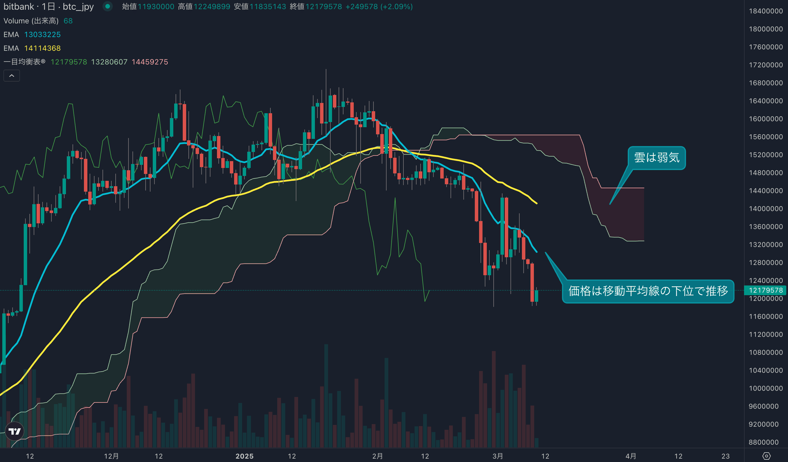- 価格は14EMA(1316万円)を下回り弱気示唆です。53EMA(1418万円)は下落しており、長期トレンドも弱気です。一目均衡表の雲は先行スパン1(1328万円)が先行スパン2(1445万円)を下回り弱気示唆です。
