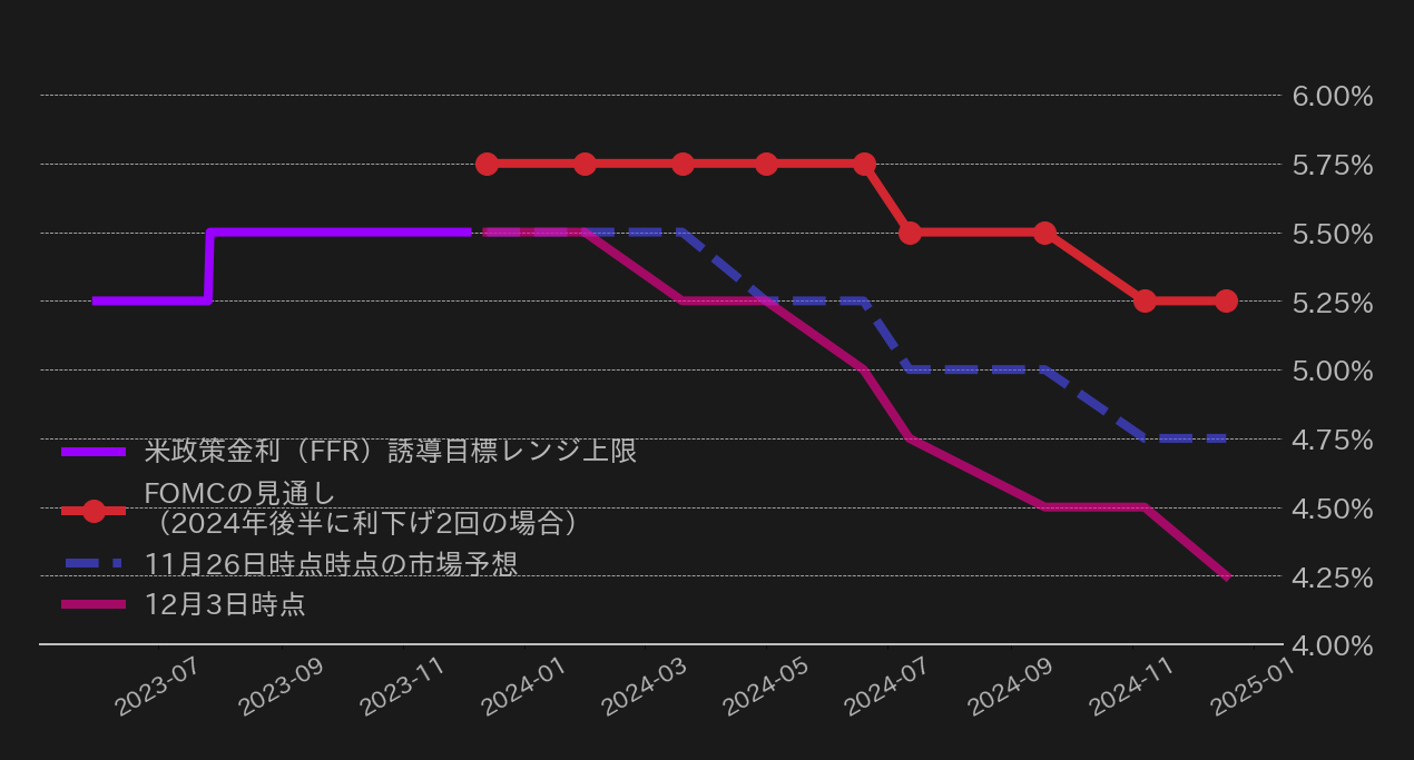 尤も、FRBは追加利上げには相当に慎重になっていると言え、12月のFOMC会合では政策金利の据え置きと共に、SEPでは金利見通しの下方修正が想定される。しかし、年間2%のインフレ目標が道半ばである現状で、FRBと市場の金利見通しの間にある1%ポイントの差が12月のSEPで解消するとは到底考え難く、市場は早期且つ急速な利下げを過剰に織り込んでいる可能性が指摘される。