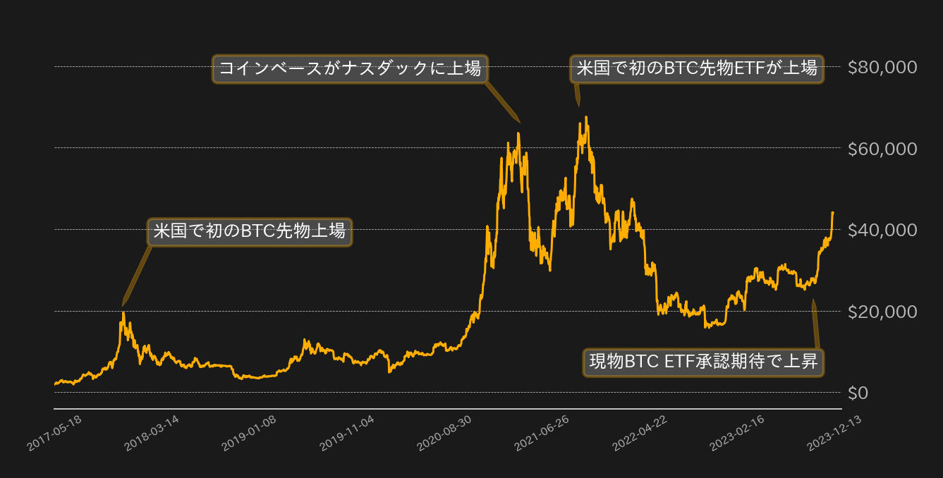 FRBによる利下げとSECによるETFの承認はファンダメンタルズ的な観点ではBTCにプラスではあるが、実際のイベントが起きる前にBTC相場は相当に上げている。BTCドルの日足相対力指数(RSI)は12月5日に80%を超えており、テクニカル的には過熱感が確認される。また、BTCドルの週足は8週連騰が視野に入っており、実現すれば2017年ぶりとなる。ETF承認への期待感は、フィデリティ以外のETFでファンドのカストディアンに指定されているコインベース(COIN)の株価にも反映されており、COINは11月、73.44%と大幅上伸を演じた。