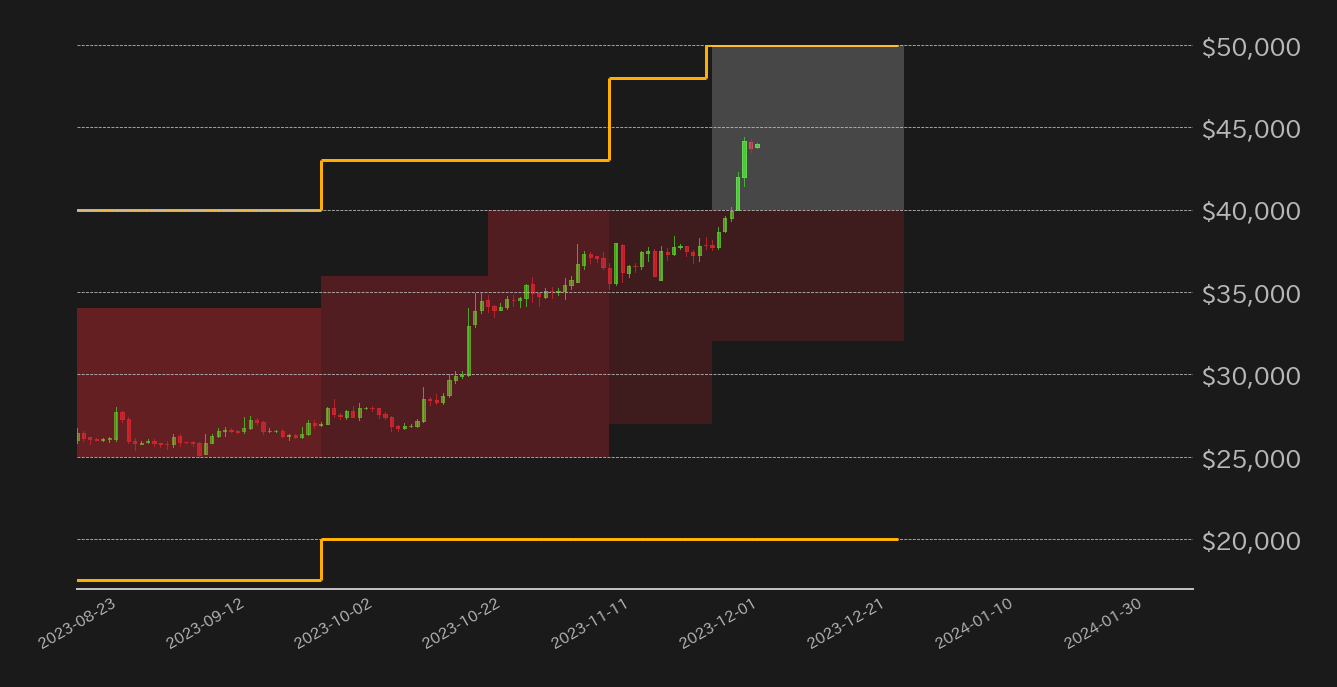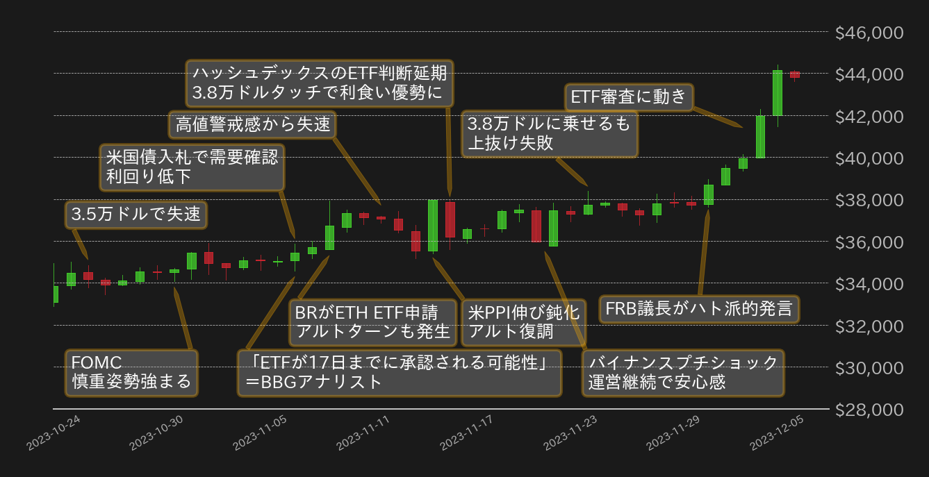 11月下旬のBTCは目星い材料に乏しい中、38,000ドルのレジスタンを背に底堅い値動きが続いたが、12月1日に米連邦準備理事会(FRB)のパウエル議長が追加利上げに対して慎重な姿勢を示したことで、米債利回りの低下を味方にBTCは遂に38,000ドルの上抜けに成功。すると、トレンドフォローの買いが相場を40,000ドル周辺まで押し上げると、オプション勢のヘッジによる買いとショートカバーを伴い、12月4日には42,000ドルにタッチした。この日はブラックロックとビットワイズが申請しているビットコインETFの修正書をSECに提出したことも市場のETF早期承認期待を掻き立て、翌5日の米時間には、相場は45,000ドル近辺まで上値を伸ばした。