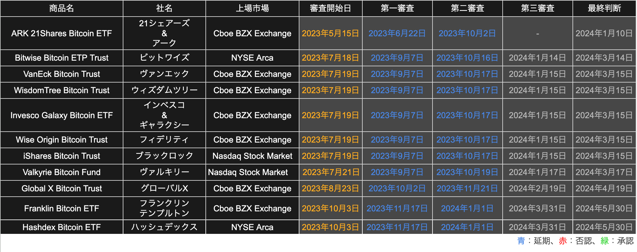 上記2件のETFは次回の判断期限が2024年1月1日となっていたが、SECは1カ月近く判断を前倒しにし、パブリックコメントの募集を始めた。12月1日には米連邦官報にSECの判断が登録されており、35日後の2024年1月5日にコメント募集が締め切られる。1月10日にはアークと21シェアーズが共同で申請した現物型ビットコインETF(ARK 21Shares Bitcoin ETF)の最終判断期限が控えており、それまでにSECは申請されている全ての現物型ビットコインETFのパブリックコメントの募集を終わらせることで、他の申請との審査スケジュールの足並み揃えようとしていると指摘され、コメント期限後の1月6日からARK 21Shares Bitcoin ETFの最終判断期限となる1月10日の間に全11件の現物型ビットコインETFが承認される可能性が浮上している。