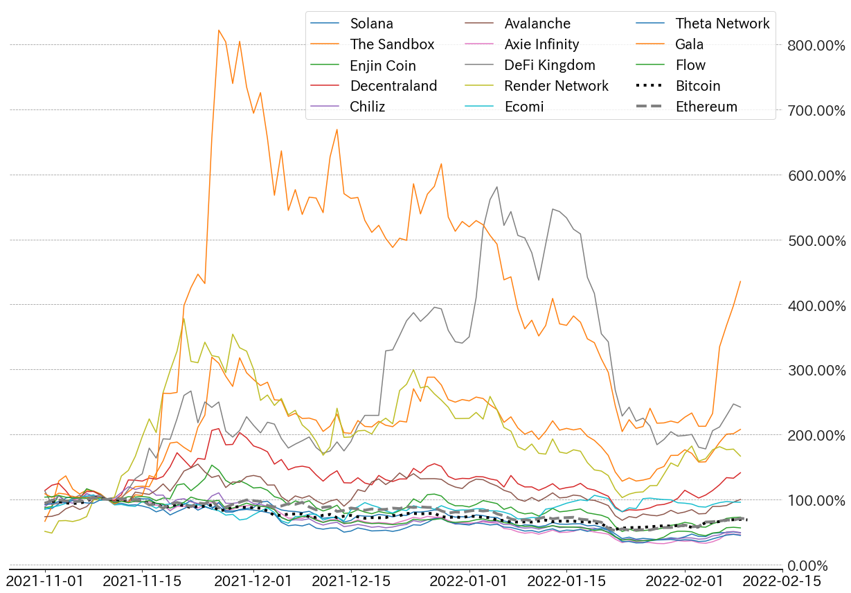 つまり、年末年始に暗号資産(仮想通貨)市場が悲観ムードとなっていた中でも、NFTとメタバース銘柄への分散投資をしていれば、ポートフォリオ全体のドローダウンを抑え、チョイスと比率によっては好成績を出せていたことになります。