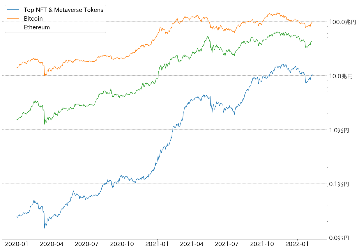 ビットコイン(BTC)の時価総額は、昨年序盤から100兆円という大台に付けて大きな話題になりました。ただ、NFT、メタバース関連銘柄(以後関連銘柄)も負けていません(本稿では、関連銘柄についてCoinGeckoのNFTとメタバースカテゴリーで時価総額が上位のソラナ(SOL)、サンドボックス(SAND)、エンジンコイン(ENJ)、ディセントラランド(MANA)、チリーズ(CHILI)、アバランチ(AVAX)、DeFiキングダム(JEWEL)、レンダー(RNDR)、エコミ(OMI)、セータ(THETA)、ギャラ(GALA)、フロー(FLOW)をピックアップします)。2020年初頭には200億円程度だった時価総額ですが、2021年初頭にはその5倍の1,000億円を超過、同年に怒涛の急拡大を経て10兆円台に乗せています。第1図はBTC、ETH、関連銘柄の時価総額チャート(ログスケール)ですが、関連銘柄の時価総額の伸びが顕著なことがわかります。足元では、イーサリアムの約5分の1、ビットコインの約10分の1くらいの時価総額に成長しています。