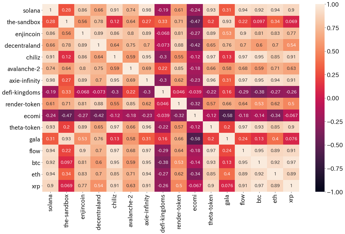 第2図は、ビットコイン相場が史上最高値を付けた2021年11月10日時点の終値を100とした、ビットコイン、イーサリアムと関連銘柄の指数化チャートとなっています。中には当時より値を安くし、ビットコインとイーサリアムよりアンダーパフォームしている銘柄(ENJ、FLOW、CHILI、THETA、AXIE、SOL)もありますが、当時と然程相場水準を変えない、或いはビットコインとイーサリアムを大きくアウトパフォームしている銘柄(GALA、JEWEL、SAND、RENR、MANA、AVAX、OMI)もあります。特にGALA、JEWEL、SANDの3名柄は、ビットコインが史上最高値を付けてから約半額になった現在までに100%以上の価格上昇を記録しており、同じ期間の相場の値動きを参照した相関マトリクスをみても、時価総額上位の銘柄から独立した動きは一目瞭然かと思います(第3図。なんとなくXRPも入れました)。