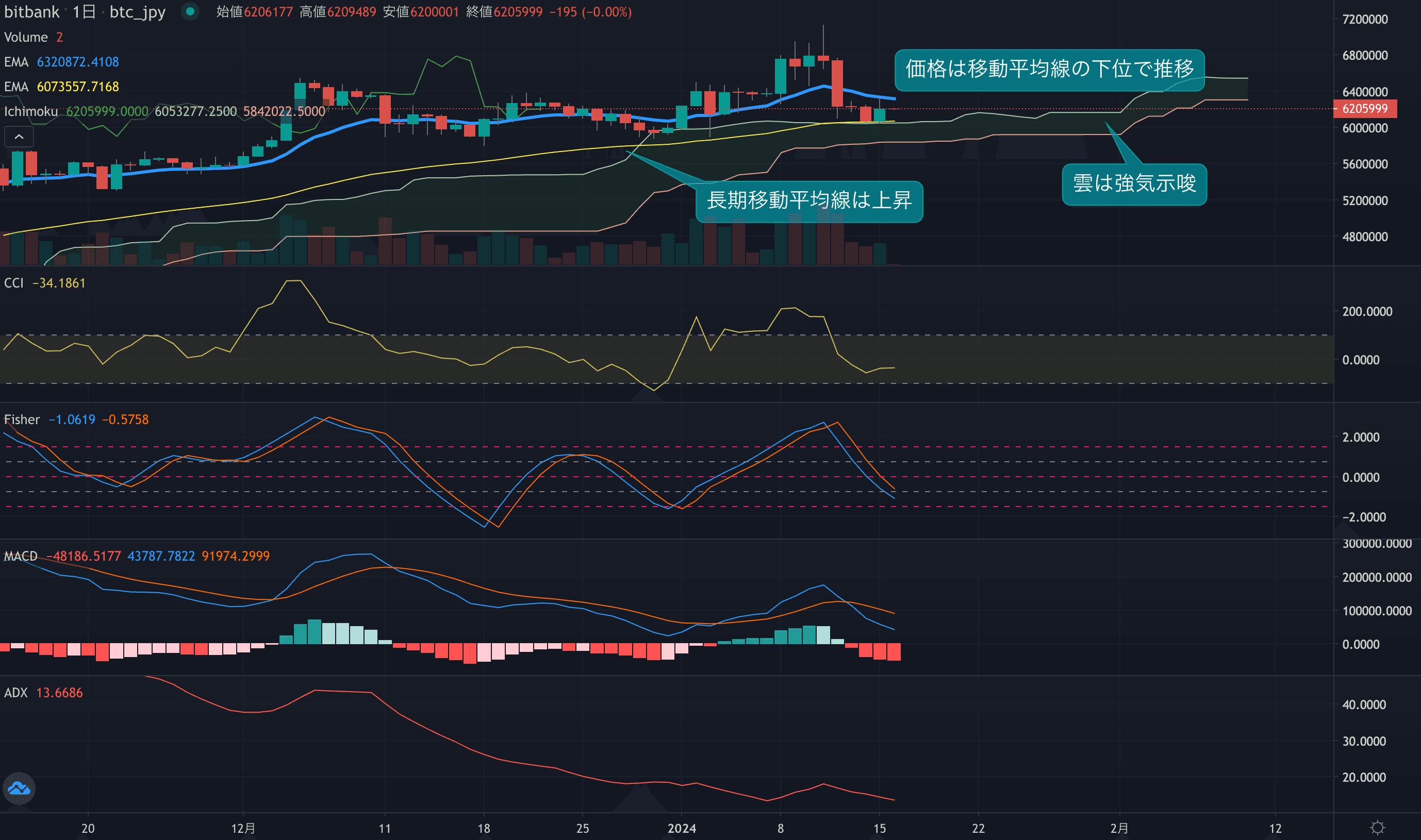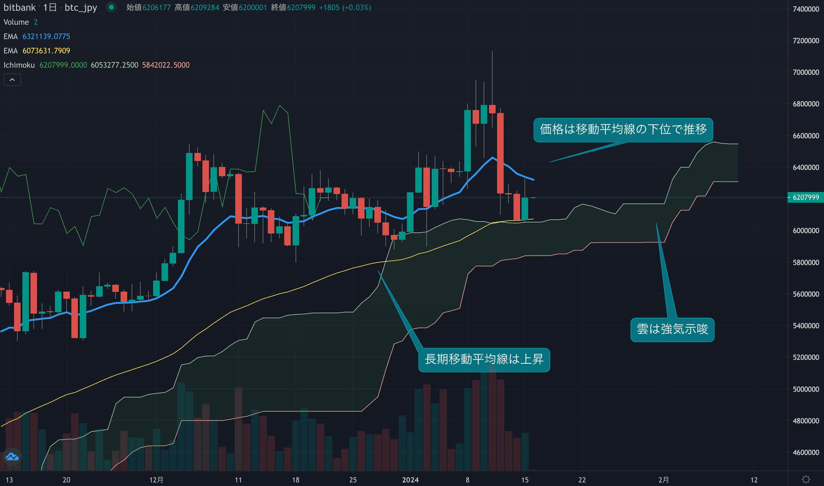 - 価格は14EMA(633.8万円)を下回り弱気示唆です。53EMA(606.8万円)は上昇しており、長期トレンドは強気です。一目均衡表の雲は先行スパン1(654.7万円)が先行スパン2(630.9万円)を上回り強気示唆です。