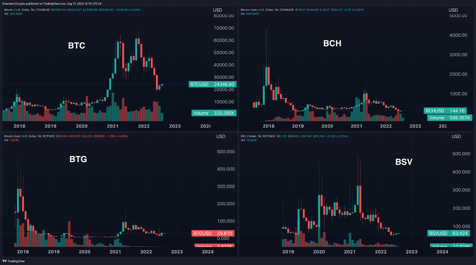 ビットコインでもこれまでに何度もハードフォークによる分岐が行われ、ビットコインキャッシュやビットコインゴールドと言った仮想通貨が誕生してきました。ユーザーにとっては、保有している仮想通貨と同量のコインが手に入るため、ある意味、空からお金が降ってくるのと同意ですが、ビットコインキャッシュ(BCH)、ビットコインゴールド(BTG)の長期チャートを見ると、2017年のバブルで付けた最高値を超えることに成功しているのはビットコインだけです。2018年11月にBitfinexに上場したビットコインSV(BSV)も、現在は初値よりも低い水準で取引されています(第1図)。
