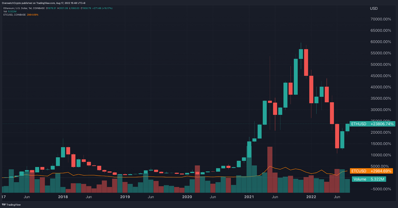 市場は勿論こうしたことを織り込んでいると言えます。Poloniexでは既にPoW版イーサのUSDT建て先物取引が開始されており、1枚=61ドル程度で取引されています。1ETHが1900ドル台で取引されているので、かなりのディスカウントと言えます。Coinbase、FTX、Binanceと言った主要取引所でもPoW版イーサ上場対応を渋っている印象があります。取引所での上場直後では仮想通貨らしいボラティリティが出て短期筋には投機チャンスがあると言えますが、長期的に期待できるとは言えません。