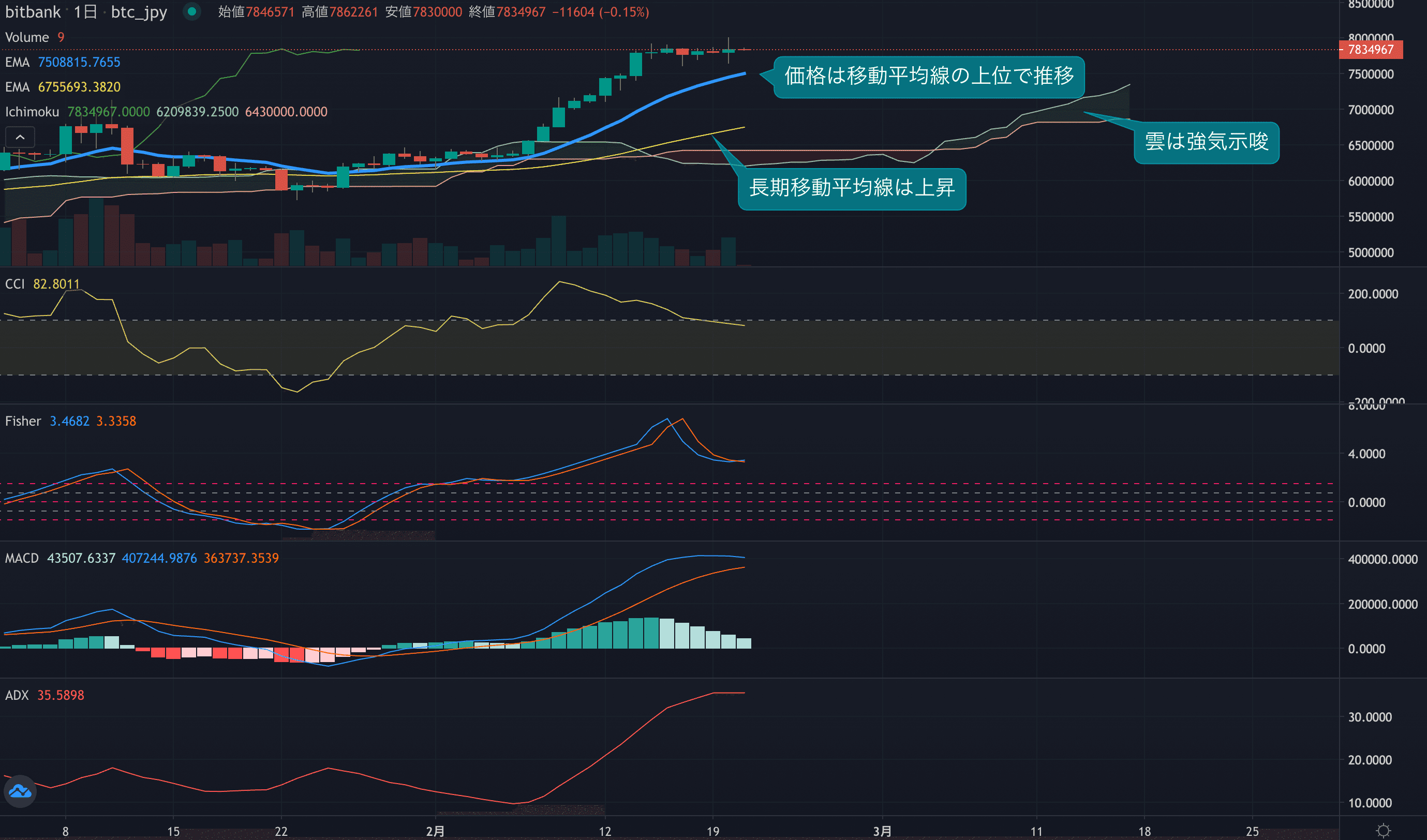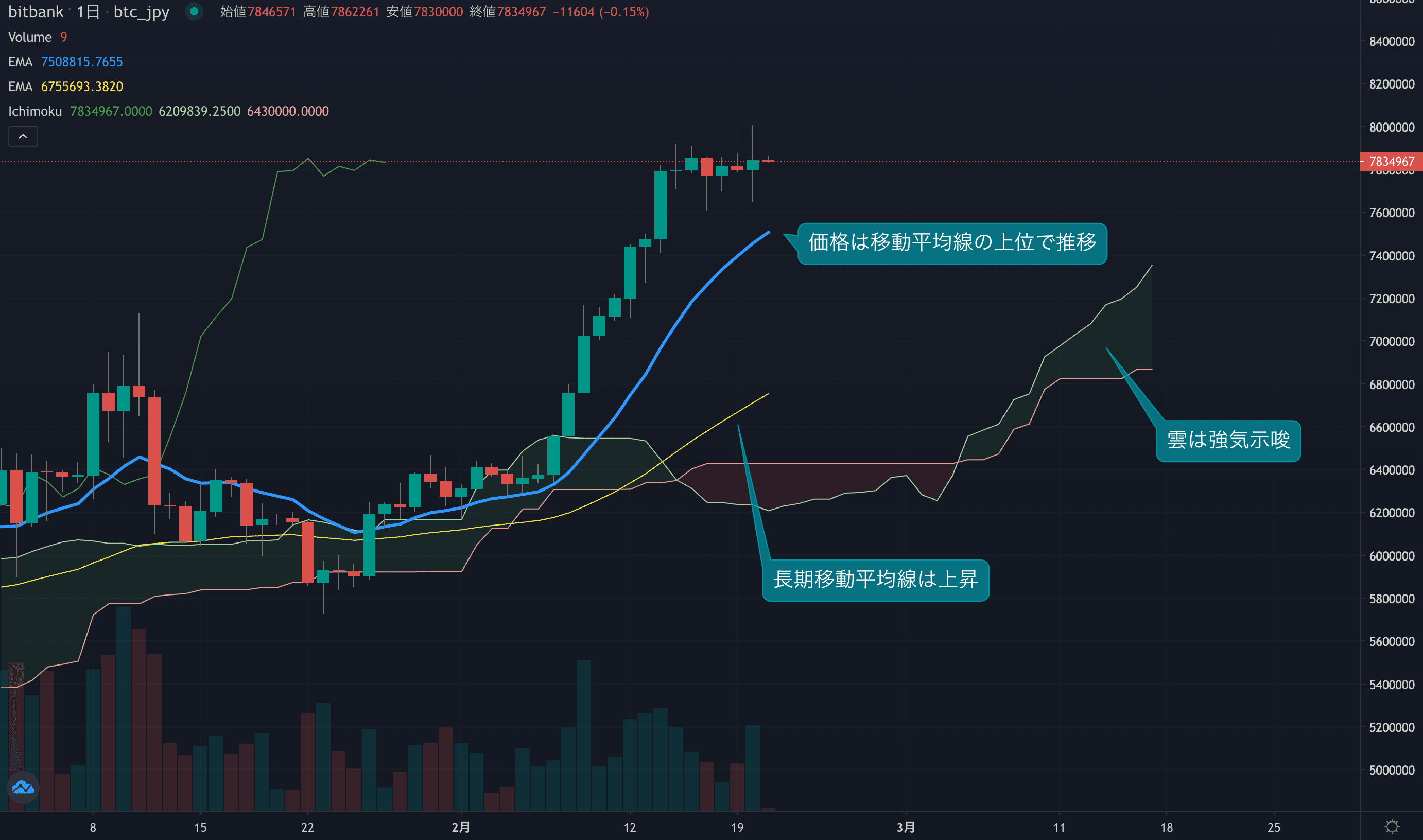 - 価格は14EMA(745.8万円)を上回り強気示唆です。53EMA(671.4万円)は上昇しており、長期トレンドも強気です。一目均衡表の雲は先行スパン1(725.3万円)が先行スパン2(686.8万円)を上回り強気示唆です。