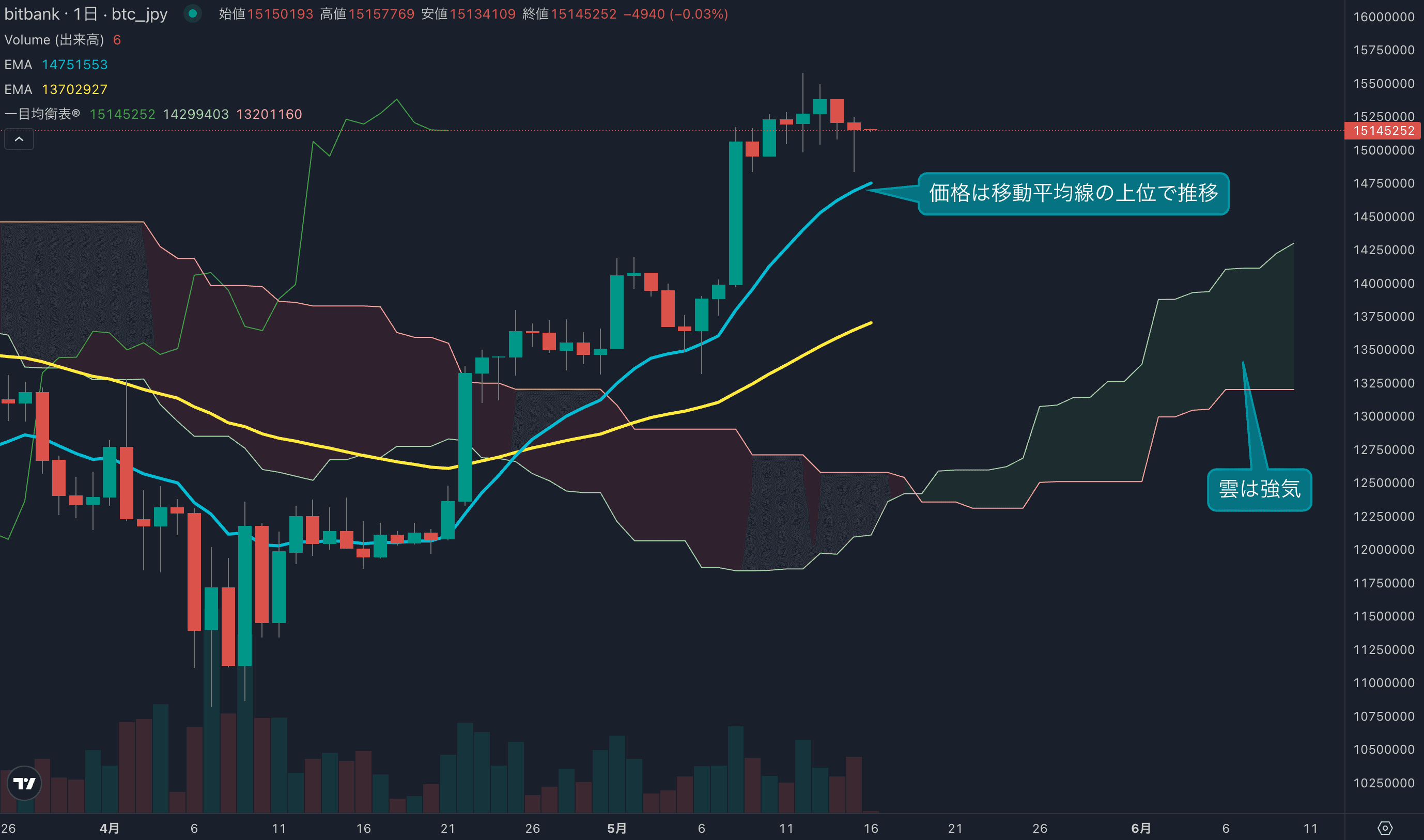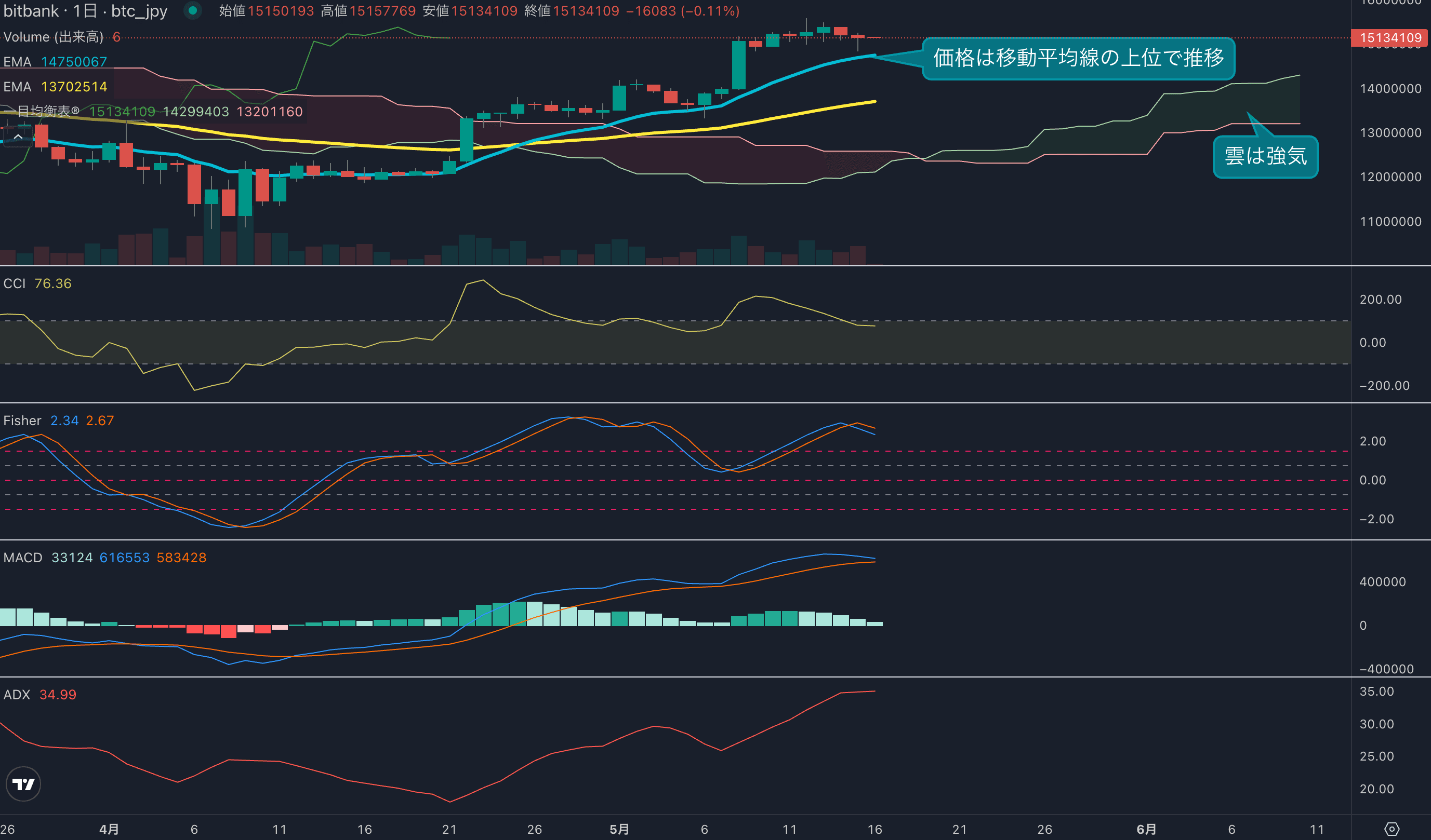 - 価格は14EMA(1469万円)を上回り強気示唆です。53EMA(1364万円)は上昇し始めており、長期トレンドも強気に傾いています。一目均衡表の雲は先行スパン1(1422万円)が先行スパン2(1320万円)を上回り強気示唆です。