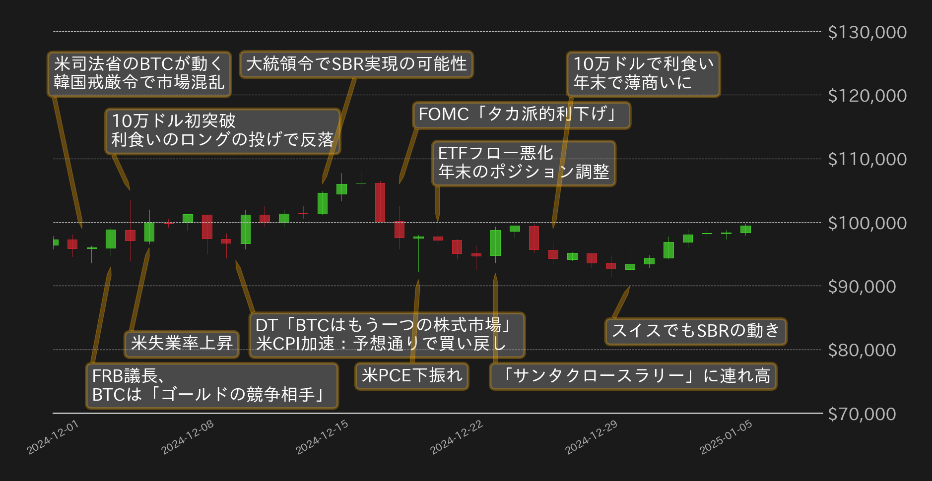 同日に公表された11月の米個人消費支出(PCE)価格指数は、市場予想を下回ったものの、クリスマス休暇を控えBTCは買いが続かず、その後はジリ安に推移。24日には米株式市場の「サンタクロースラリー」に牽引され、9万9315ドルまで戻したが、大台の10万ドル周辺で利食いが入り、そのまま年末まで薄商いで小緩む地合いが続いた。