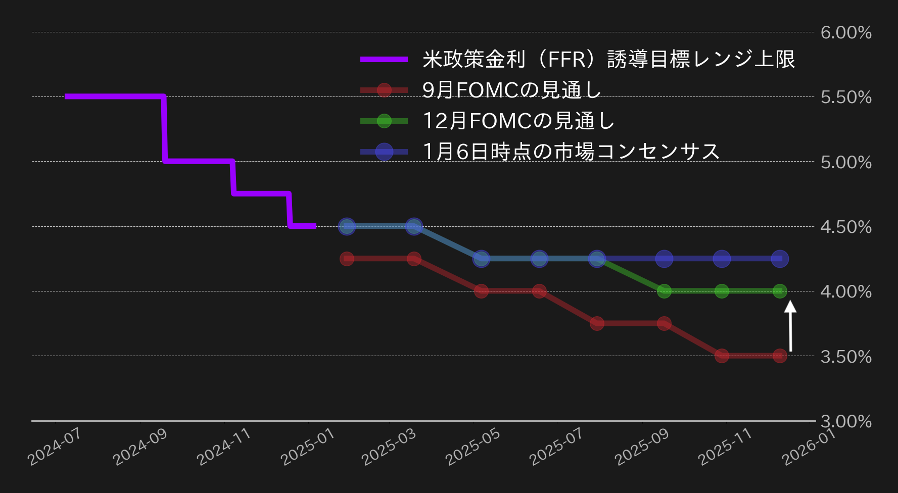 11月の米大統領選挙でトランプ氏が勝利したことによるBTCのトランプラリーは、12月のFOMCを境目に一服したと言えよう。FOMCでは追加の25bp利下げが決定された訳だが、2025年のインフレ見通しがFRBの目標に近い+2.1%から+2.5%まで引き上げられ、インフレの上振れリスクが強調された印象もあった。