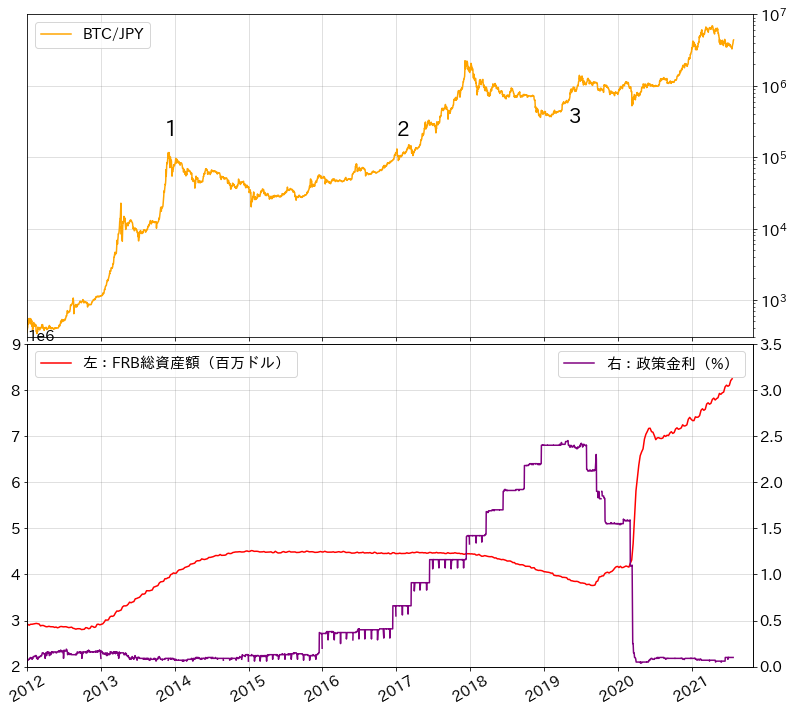 ただ、過去のパターンを見返すと、テーパリングが始まり金融の引き締めが進むにつれてビットコインの価格が下落し続けているわけでもない。周知の通り2016年から2017年にかけてビットコインは長期的な上昇トレンドを形成しているが、この間、政策金利は上昇し続けている(第1図内「2」)。また、FRBのバランスシート縮小局面でも、2019年には米中貿易摩擦を追い風にビットコイン価格は上昇していた(第1図内「3」)。