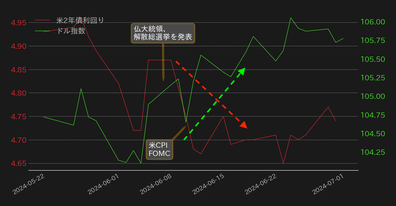 5月の米経済指標は、雇用統計の上振れサプライズがあったものの、消費者物価指数(CPI)、卸売物価指数(PPI)、個人消費支出(PCE)価格指数は、それぞれ+3.4%→+3.3%、+2.3%→+2.2%、+2.7%→+2.6%と前年同月比で伸びが鈍化。FF金利先物市場はCPIを通過するまで年内利下げ回数の予想を1回〜2回で決めかねていたが、現状では9月と12月で2回の利下げがコンセンサスとなっている。