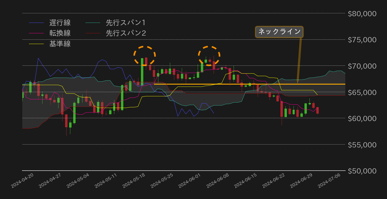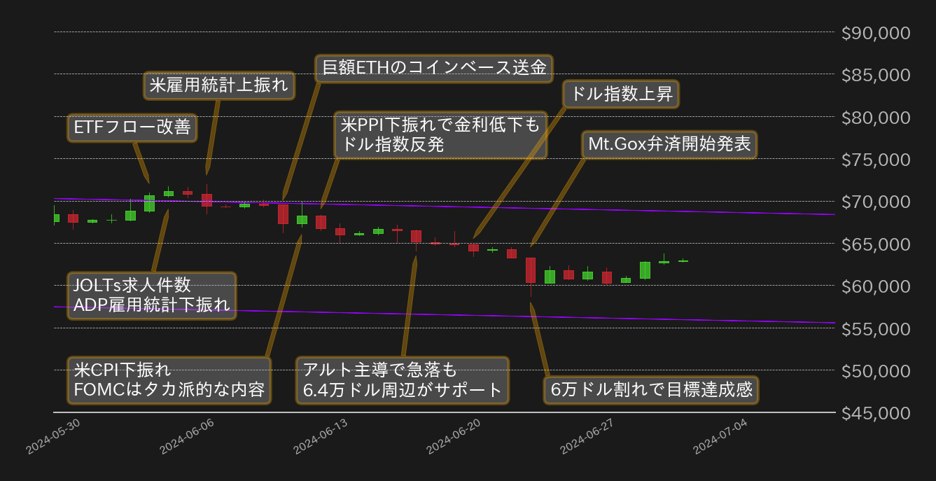 6月後半のBTC相場は、引き続きアルト相場の軟化やドル指数の上昇が相場の重石となり、65,000ドル下抜けを窺う展開を繰り広げると、24日にはMt.Gox管財人事務所が7月からのBTC・ビットコインキャッシュ(BCH)の弁済を開始すると発表し、一時は58,693ドルまで急落した。