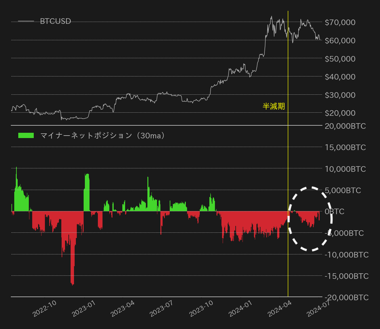 加えて、BTCドルはFOMC通過後の6月14日にダブルトップのネックラインを下抜け、上昇トレンドの反転シグナルが点灯、21日には強い売りシグナルとされる一目均衡表の三役逆転が完成し、テクニカル的な地合いが悪化した(第3図)。そんな中、BTCには需給面では、①米国とドイツ政府による複数回に渡る取引所へのBTC送金、②半減期後のマイナーの換金需要増加(第4図)、③7月から始まるMt.GoxのBTC弁済開始を懸念した売りなどが相場の重石となった格好だ。
