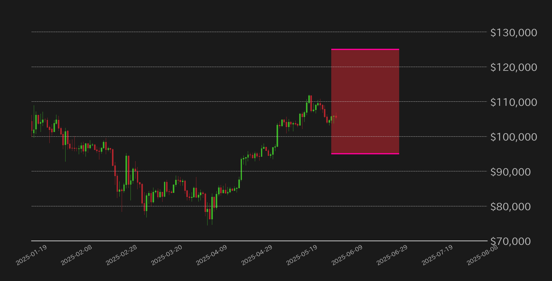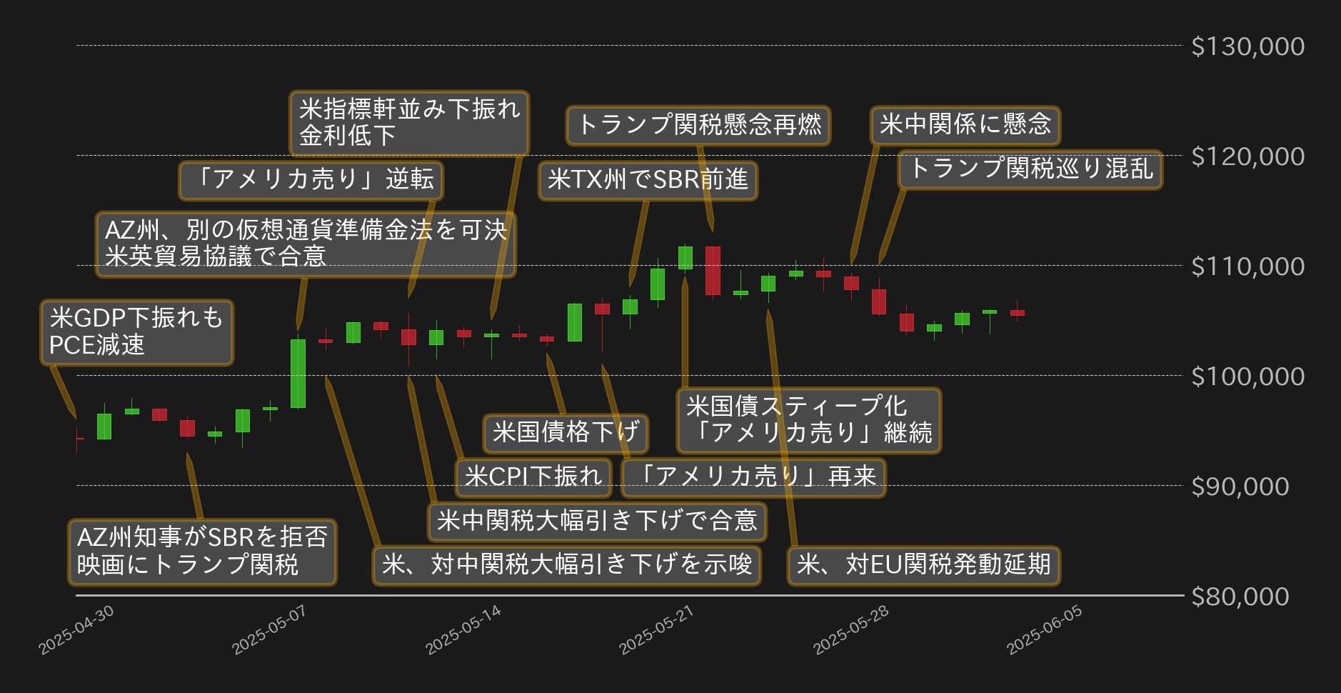 その週末の間にトランプ氏はEUに対する追加関税発動を7月9日まで延期すると発表し、相場は11万ドル周辺まで反発したが、28日にはトランプ政権が半導体設計ソフトを提供する国内企業に対して中国との取引を停止するよう命じたと報道された他、29日には米国債貿易裁判所がトランプ関税の大部分が憲法で与えられる大統領権限を逸脱していると判断したことで市場は混乱。これに乗じてBTCは月末にかけて軟化し、月足終値は10万5000ドルを割り込み、10万4627ドルとなった。