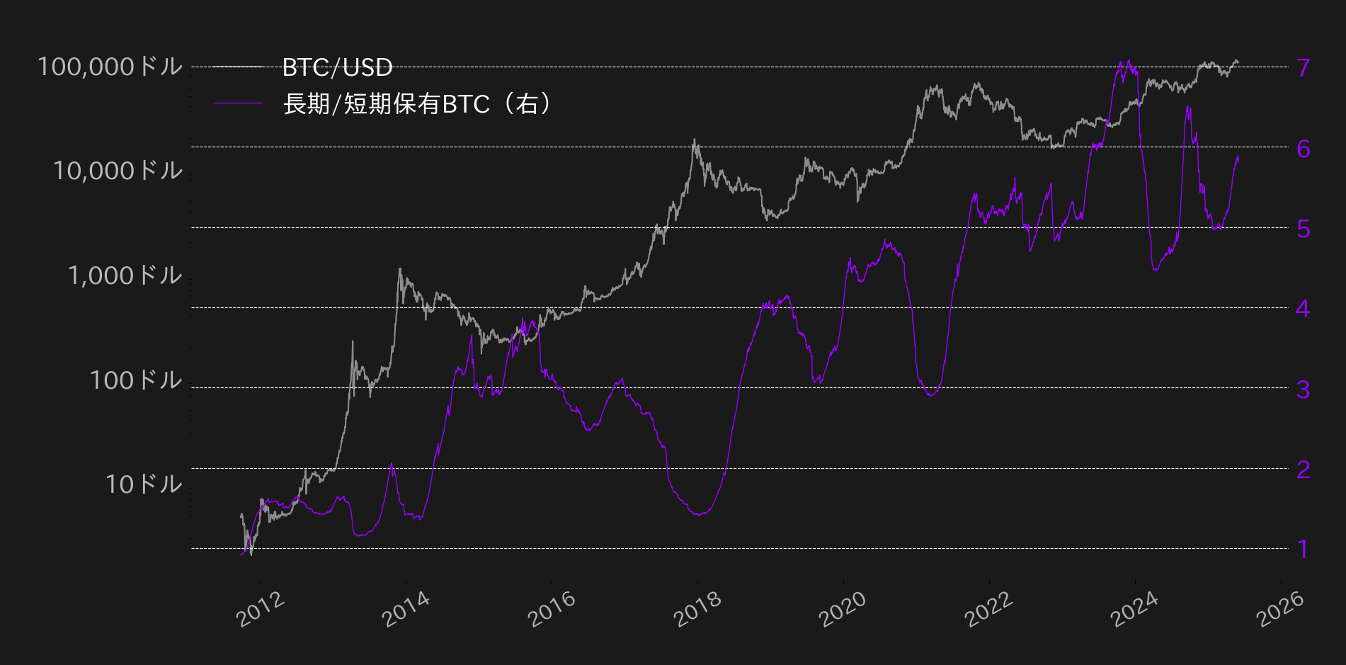 第3図は流通するBTCの中で長期で保有(Long-Term Holder、LTH)される枚数を短期で保有(Short-Term Holder、STH)される枚数で割った指標(レシオ)となる。3月の時点で短期筋の損切りが出尽くし、翌4月には相場が底をついたと言えるが、それ以降で新規の短期筋の流入が鈍っていることがわかる。