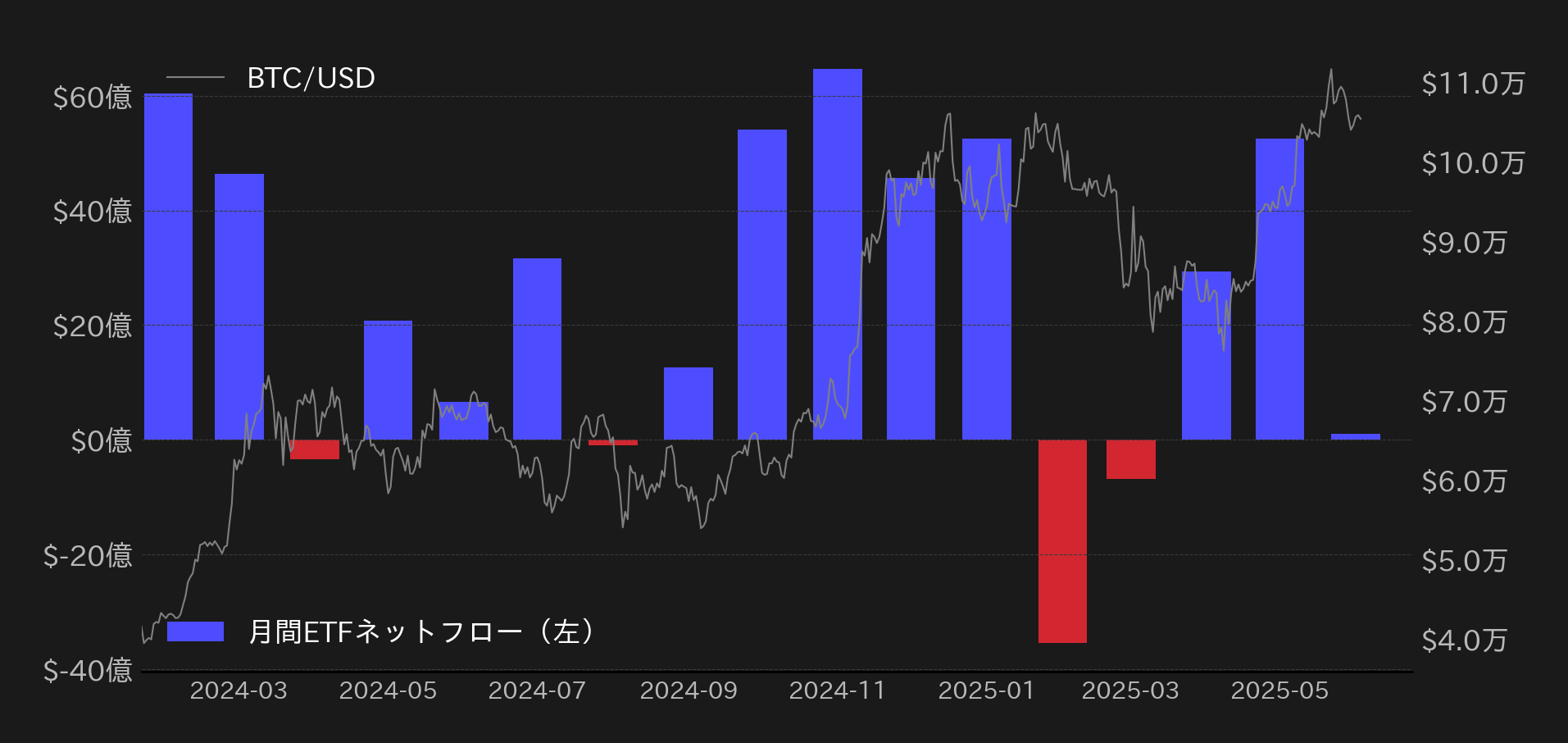 5月の米国の現物ビットコインETFには、54億ドルの純流入が記録されており、月間では取引が開始された2024年1月から4番目に多い資金の流入となっている。今年の2月〜3月には約-42億ドルの純流出があったが、4月〜5月で完全に流出分を奪回した。