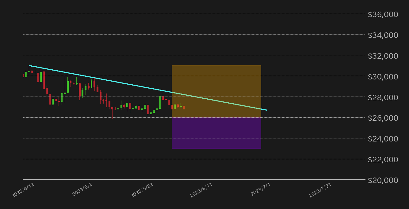 しかし、債務上限法案の下院での採決を前に一部共和党員から法案への批判が浮上すると、米株市場では警戒ムードが広がり、BTC相場も28,000ドルの維持に失敗。加えて、米クリーブランド地区連銀のメスター総裁が、「利上げを停止する説得力のある理由はない」とFTとのインタビューで発言し、相場は27,000ドル周辺まで押し返された。