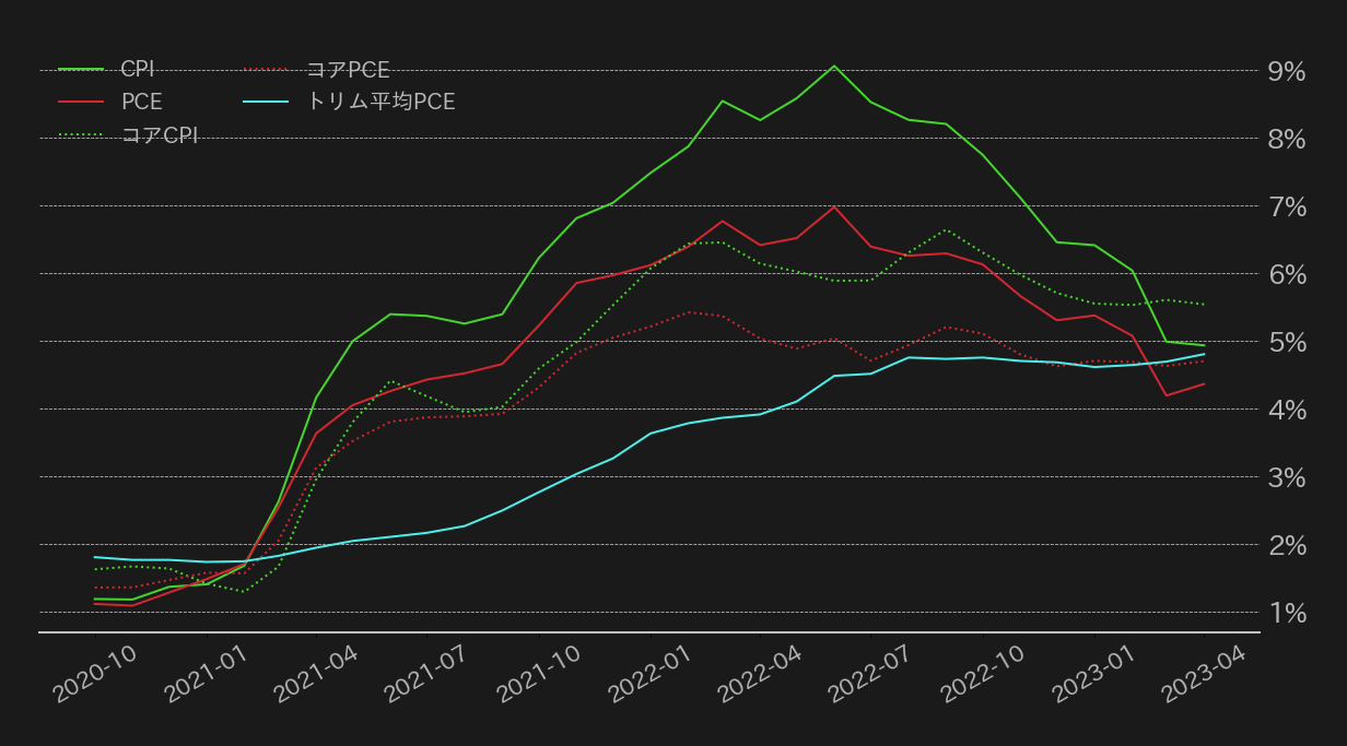 4月のCPIとPCE価格指数は、前年同月比で3月の減速ペースから鈍化しており、食品とエネルギー価格を除いたコア指数は双方とも高止まりの状態が昨年末から続いており、メスター総裁が利上げを停止する「説得力のある理由がない」と言うのも無理はない。また、インフレの中長期的なトレンドの指標となるトリム平均PCEインフレ率が3・4月で徐々に加速していることにも注目したい。同指標はタカ派として知られる米セントルイス地区連銀のブラード総裁も着目しているインフレ指標となっており、ブラード氏は現状の利上げサイクルでは予てからフロントローディング(できる限り利上げを前倒しして行うこと)を支持してきている。