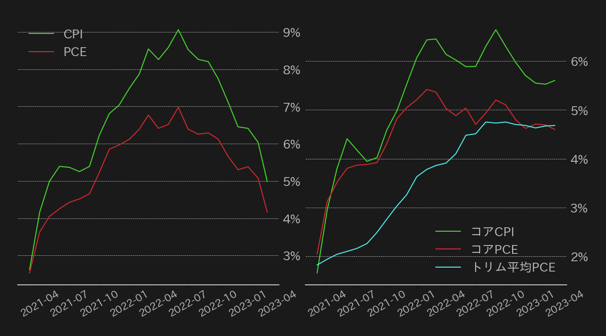 加えて、米国の消費者物価指数(CPI)や個人消費支出(PCE)といったインフレ指標は、ヘッドラインでは減速が確認される一方、食品とエネルギーを除くコア指数、及び中長期的なインフレのトレンドを示すトリム平均PCEインフレ率では依然として高止まりが確認されており、著しい改善が見られるとは到底言えない状況だ(第2図)。前年同月比のヘッドラインCPIやPCEの低下は、昨年春の原油価格高騰によるベース効果の現れと言え、必ずしも正確にインフレのトレンドを示せていない。