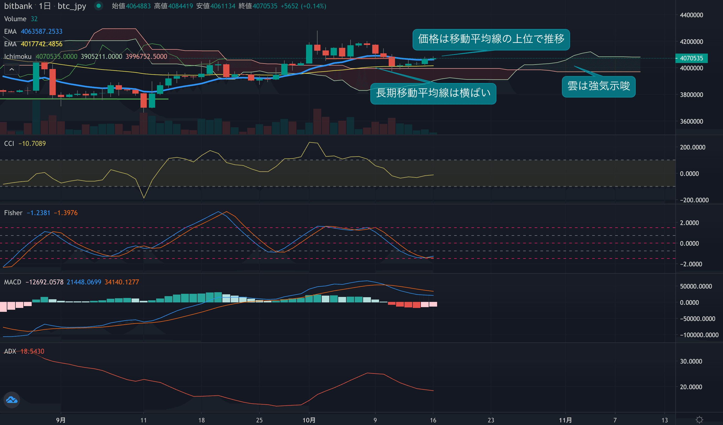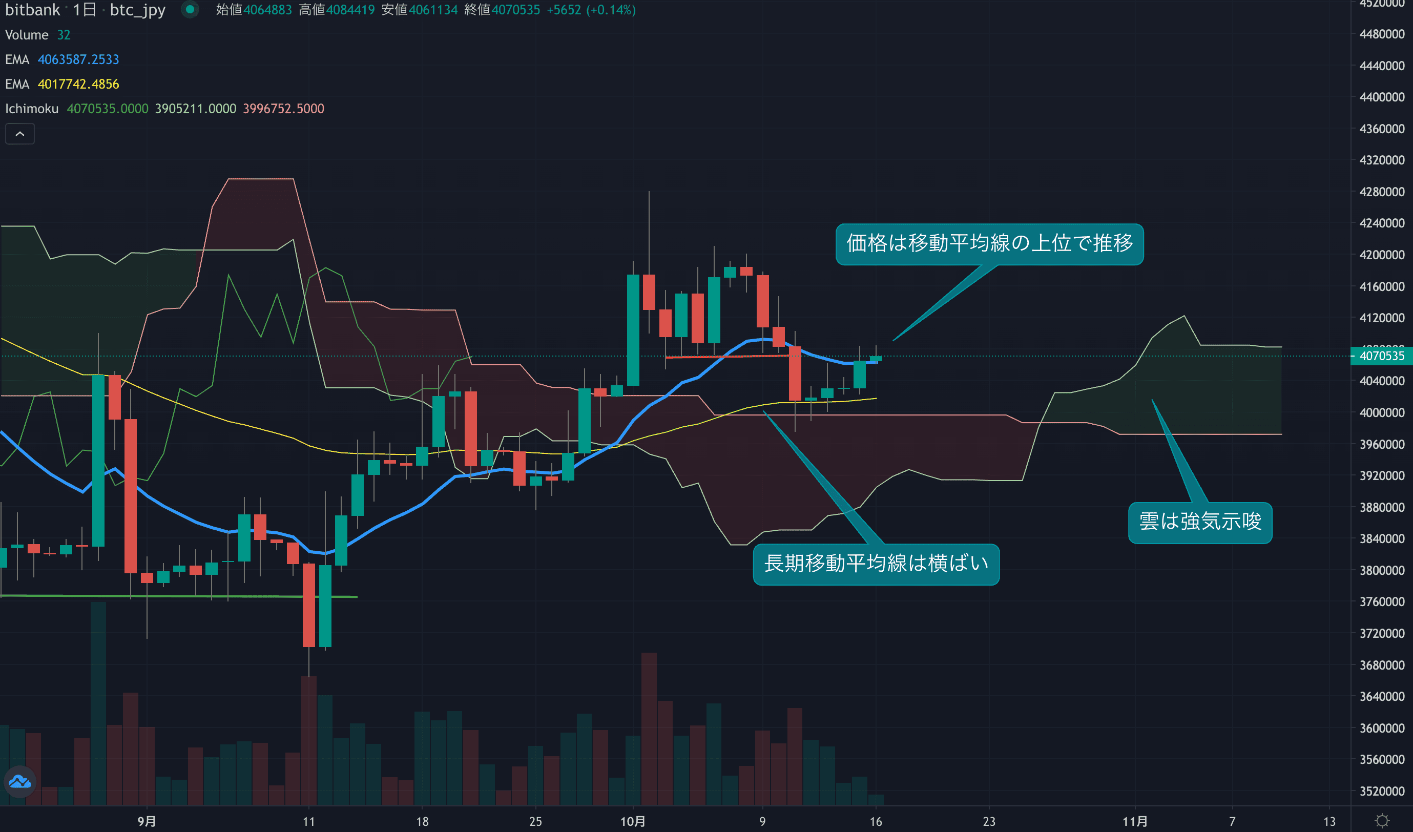 - 価格は14EMA(406.2万円)を上回り強気示唆です。53EMA(401.5万円)は横ばい推移しており、長期トレンドは中立です。一目均衡表の雲は先行スパン1(408.2万円)が先行スパン2(397.2万円)を上回り強気示唆です。