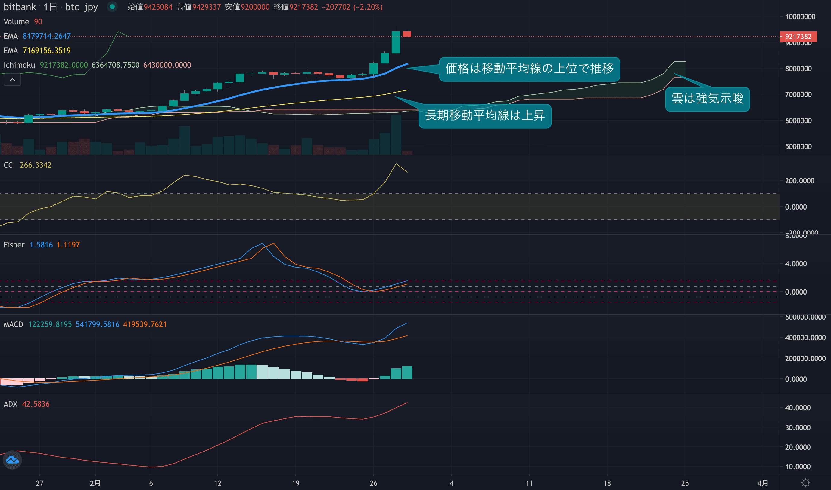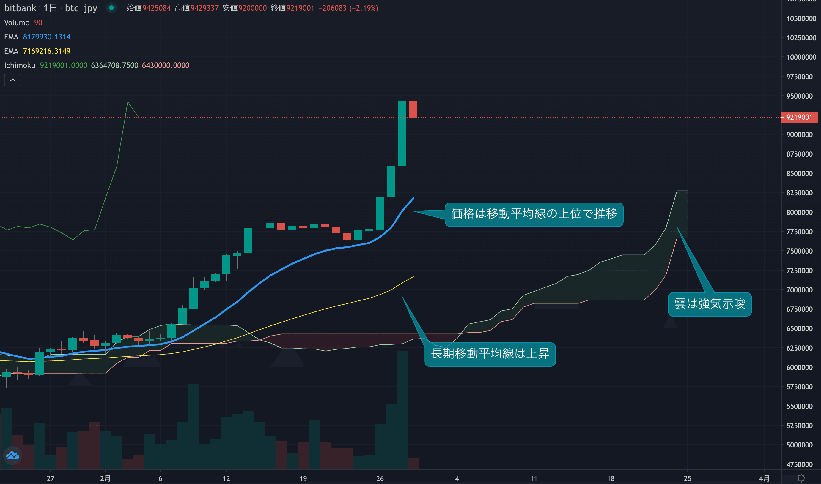 - 今週のビットコインは昨日の値動きで最大22%上昇しました。本日は2月最終日ですが、月足は現在46%となっています。強い買いが継続し、昨日は約1か月半ぶりの出来高も記録しています。チャートは非常に強い状態となっていますが、短期的には買いが一巡した可能性があります。昨日は一時960万円まで上昇した後、890万円台まで急落する場面もあり高値が意識され始めています。日足も短期移動平均線からかなり乖離しており、相場には過熱感が見られます。昨日の高値960万円近辺はレジスタンスとなることも想定されます。