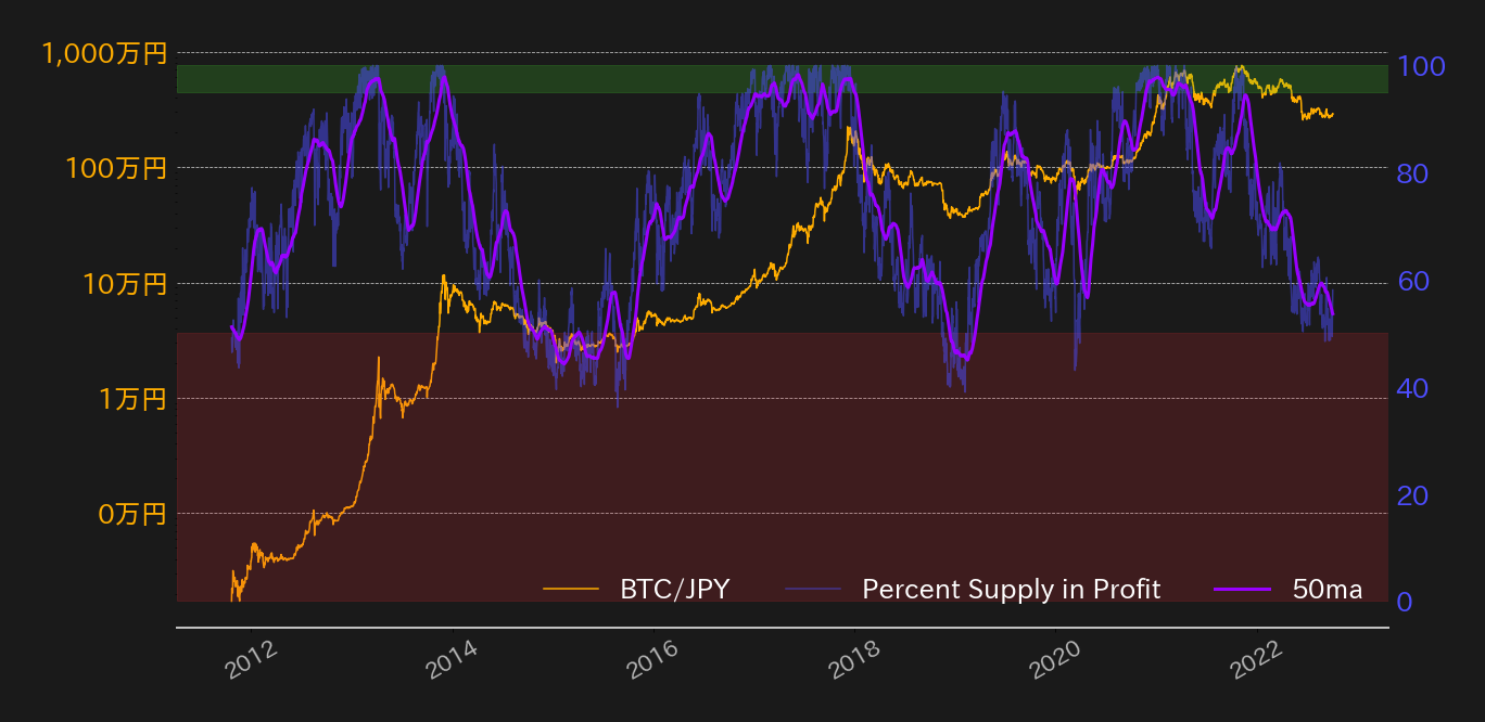 こうした中、先月も指摘の通り、流通するBTCの含み益割合は「売られ過ぎ」とされる50%以下の水準に達し、潜在的売り圧力が減退したことで、相場が上にも下にも動きづらい膠着状態に陥ったと指摘される。