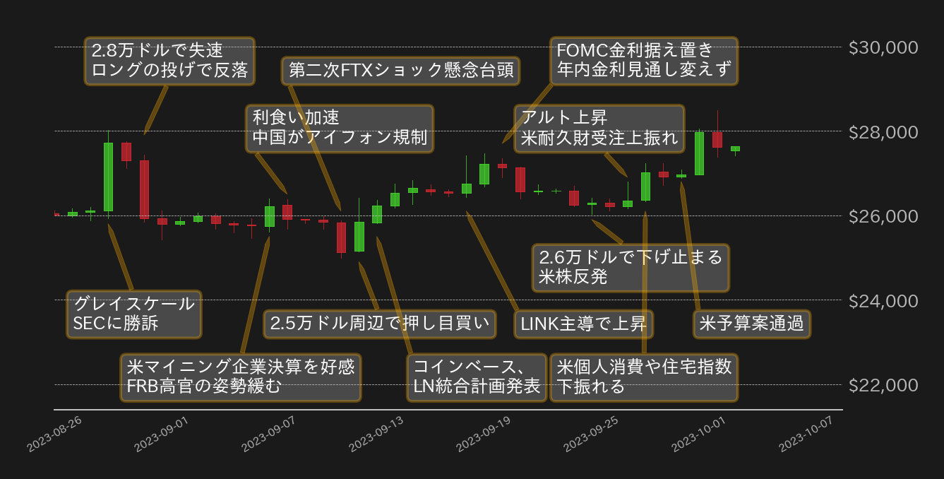 ところが、月末に差し掛かるとQ2の米個人消費確報値が下方修正された他、8月の米中古住宅販売成約指数が大幅に下振れ、米債利回りが反落。これを受けてBTC相場は26,000ドルから再び反発すると、30日に米議会がつなぎ予算案を通過させ、翌10月1日には28,000ドルを試す展開となった。