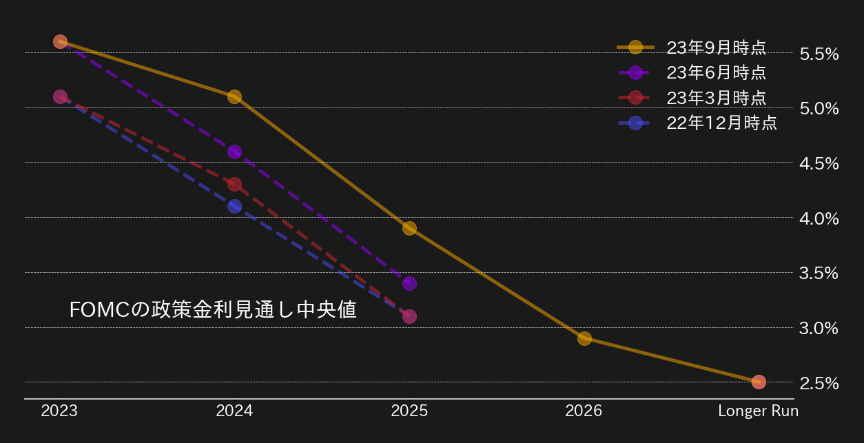 上述の通り、FOMCは9月の経済見通し(Summary of Economic Projections = SEP)にて今年以降の金利見通しを引き上げた(第4図)。これまでも見通しを引き上げてきたことに変わりはないが、今回の見通しの引き上げ幅は前回2回と比較しても大きく、ニュースや場況では金利がより高い状態が長期的に維持されるという意味で「Higher for Longer」というキーワードが散見されるようになった。9月のFOMC会合から1週間以上が経過した現在でも、米長期金利と10年物実質金利の上昇は続いており、市場は金利の「Higher for Longer」への懸念を消化しきれていない模様だ。
