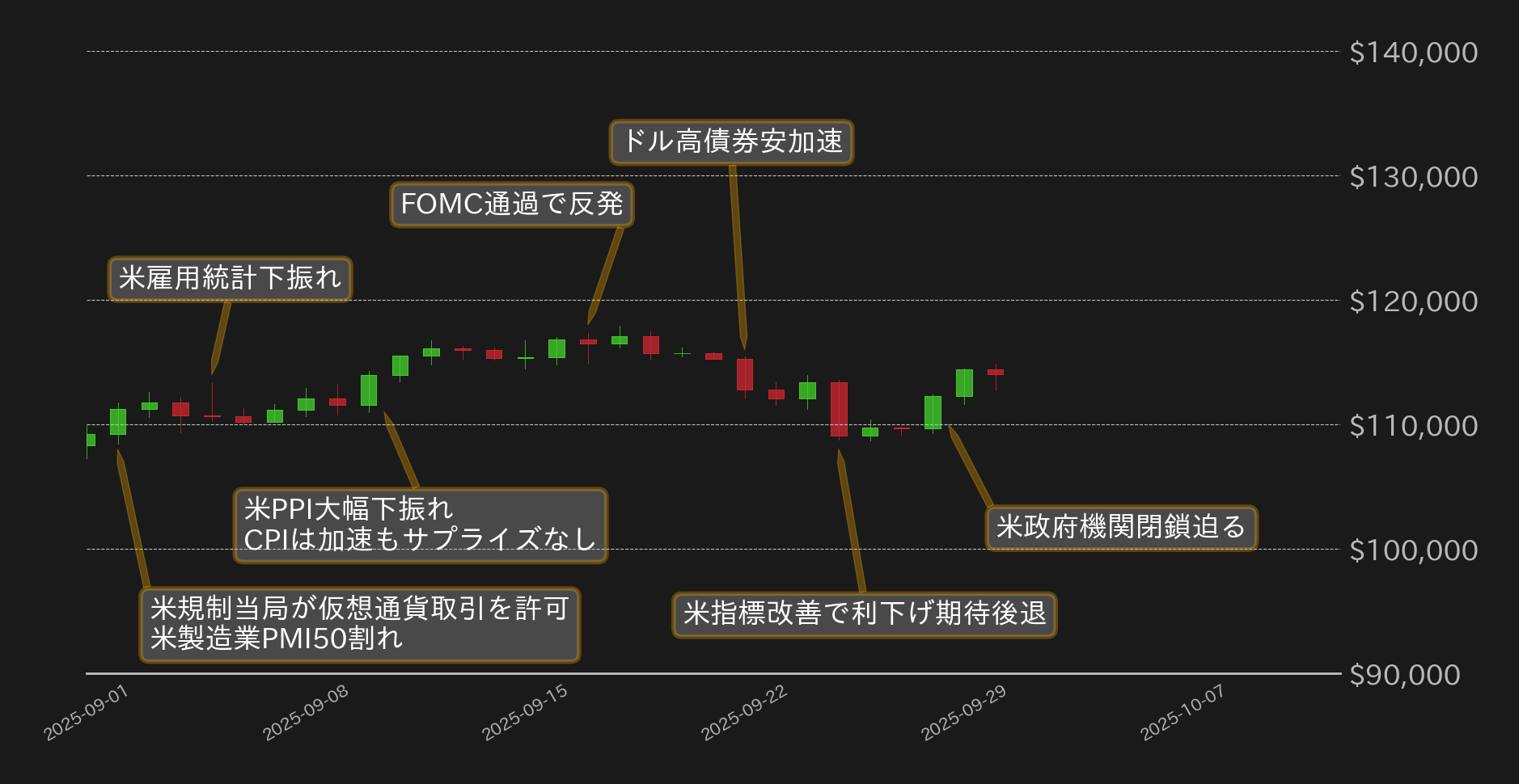 一方、FOMCは来年に1回の利下げ見通しが示されたことで、3回の利下げを見込んでいた金融市場ではドル高・債券安(金利は上昇)が加速。BTCは暫く底堅い推移を保っていたが、22日には11万2000ドル台まで下落すると、第2四半期の米GDP成長率などの一連の四半期次の経済指標が改善したことによる利下げ期待の後退によって、25日には節目の11万ドルを割り込み、9月前半の上げ幅の殆どを吐き出した。